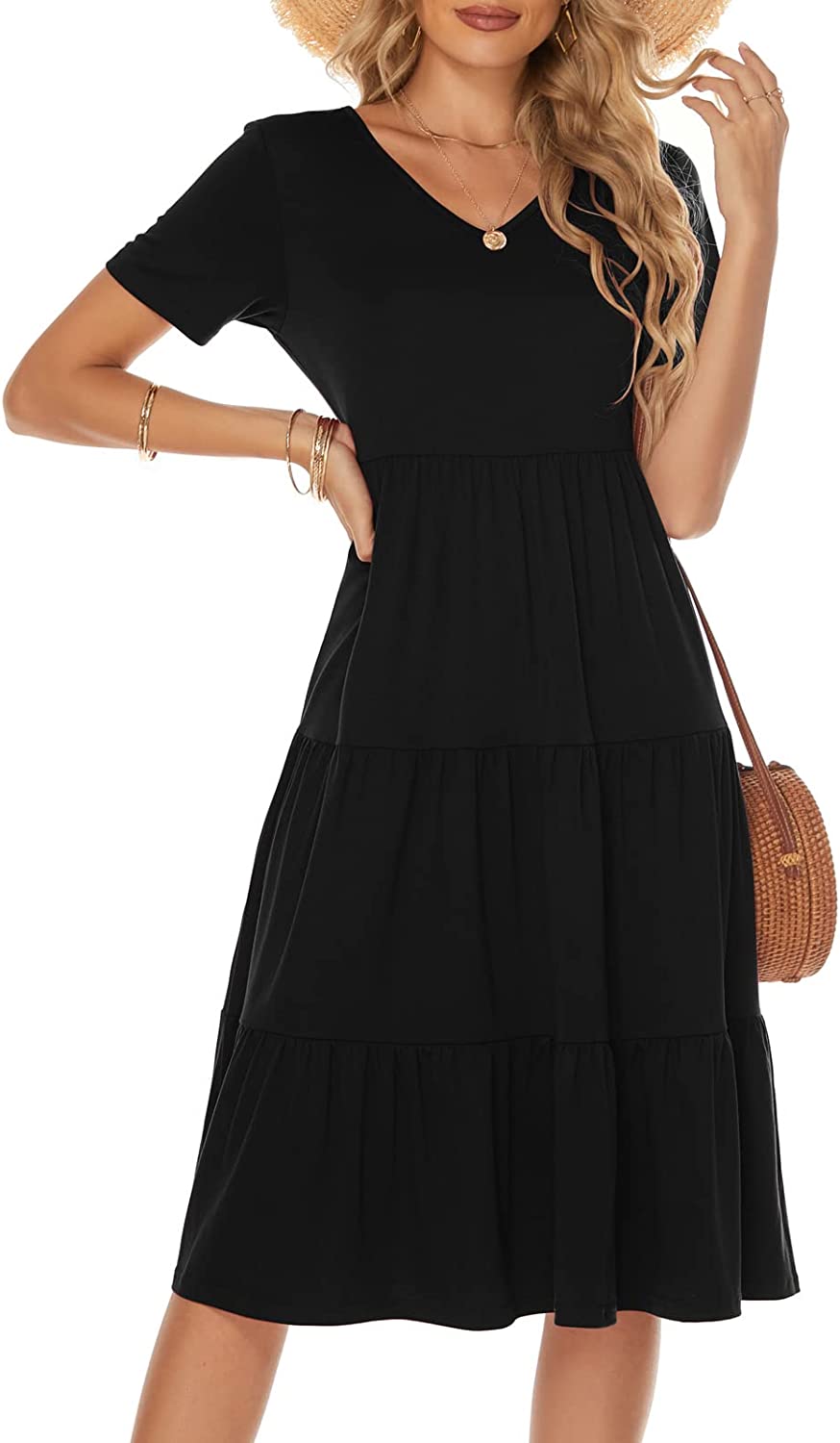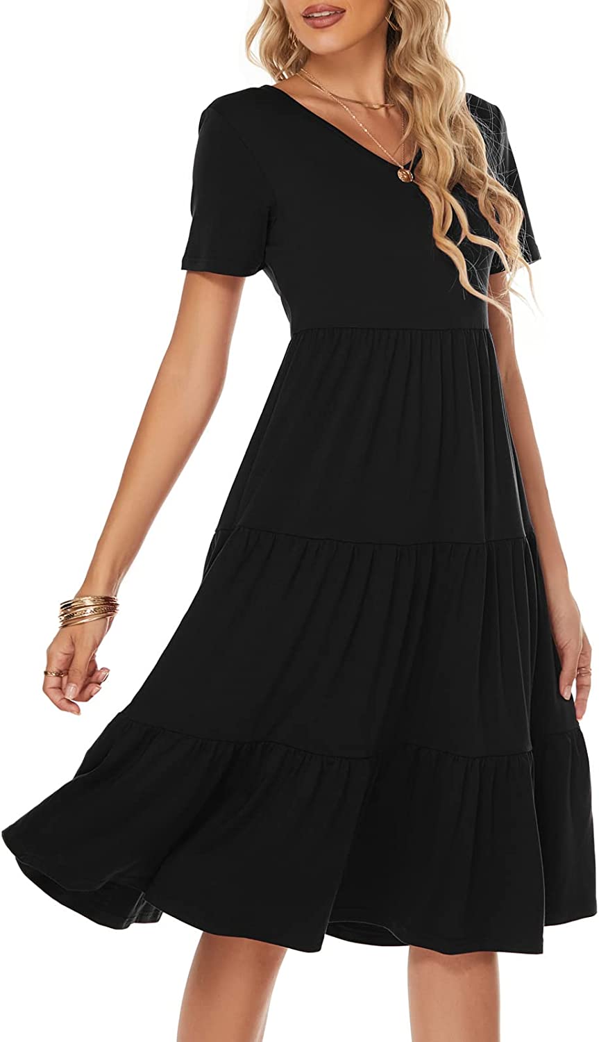 Women's Casual Summer Tiered Midi Dress Short Sleeve V-Neck Loose Cotton Ruffle Babydoll Dress Boho Sundress
