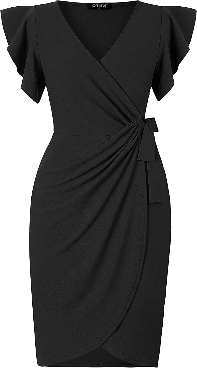 Womens Deep V Neck Ruffle Sleeve Sheath Casual Cocktail Party Work Faux Wrap Dress