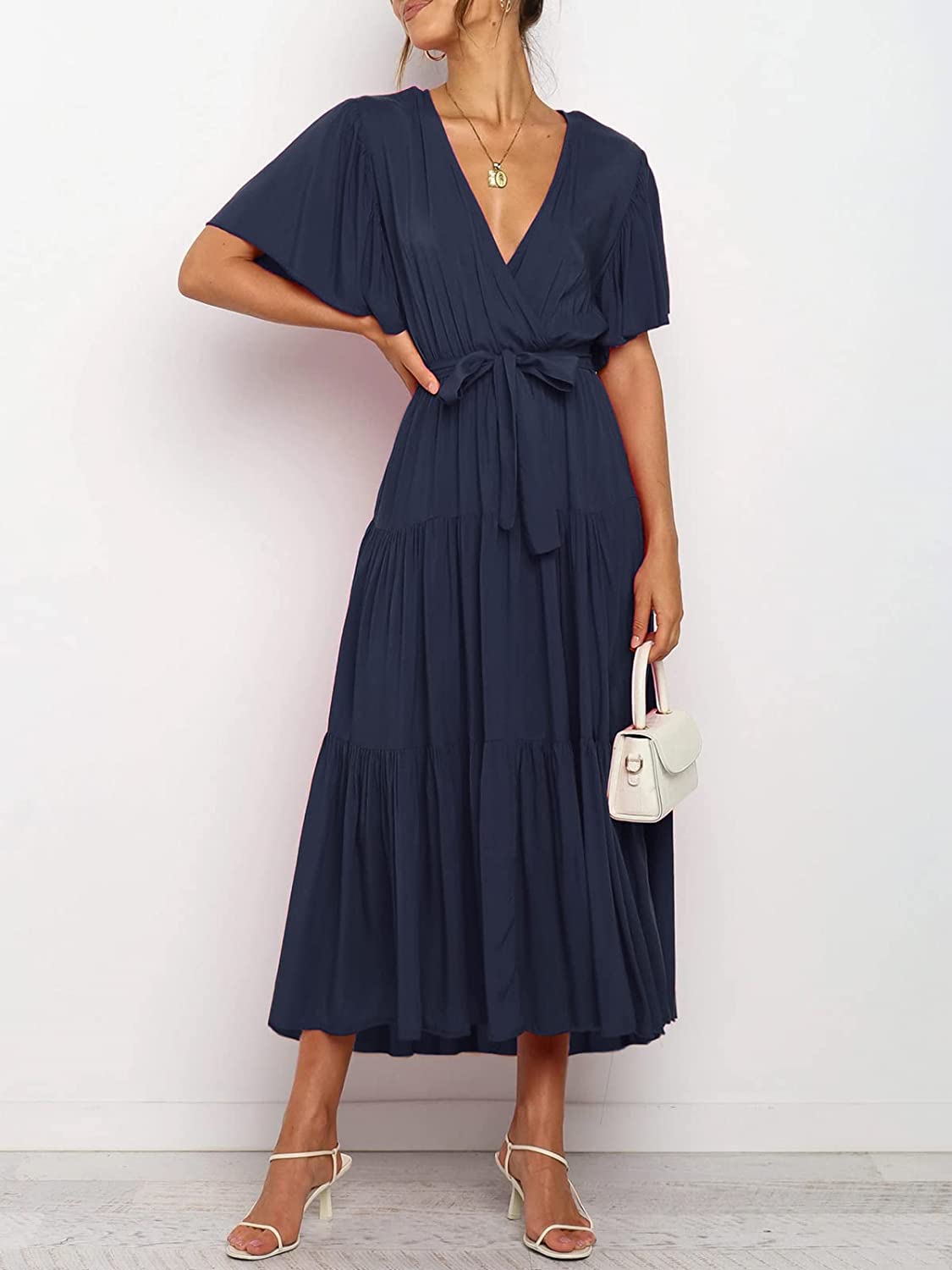 Women's Maxi Dress Summer Short Sleeve Chiffon Dresses Casual V Neck Tie Waist Formal Dress