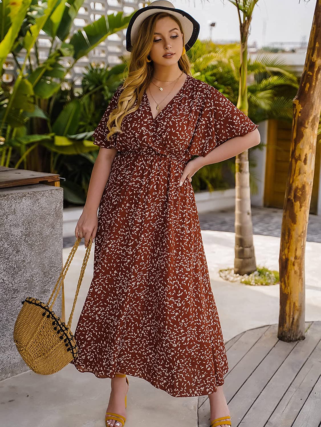 Women's Plus Size Boho Floral V Neck Short Sleeve A Line Long Dress