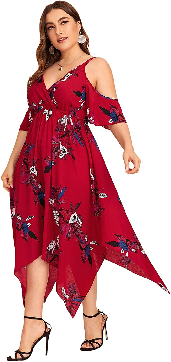 Women's Plus Size Cold Shoulder Tropical Floral Slit Summer Maxi Dress