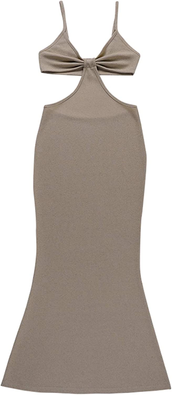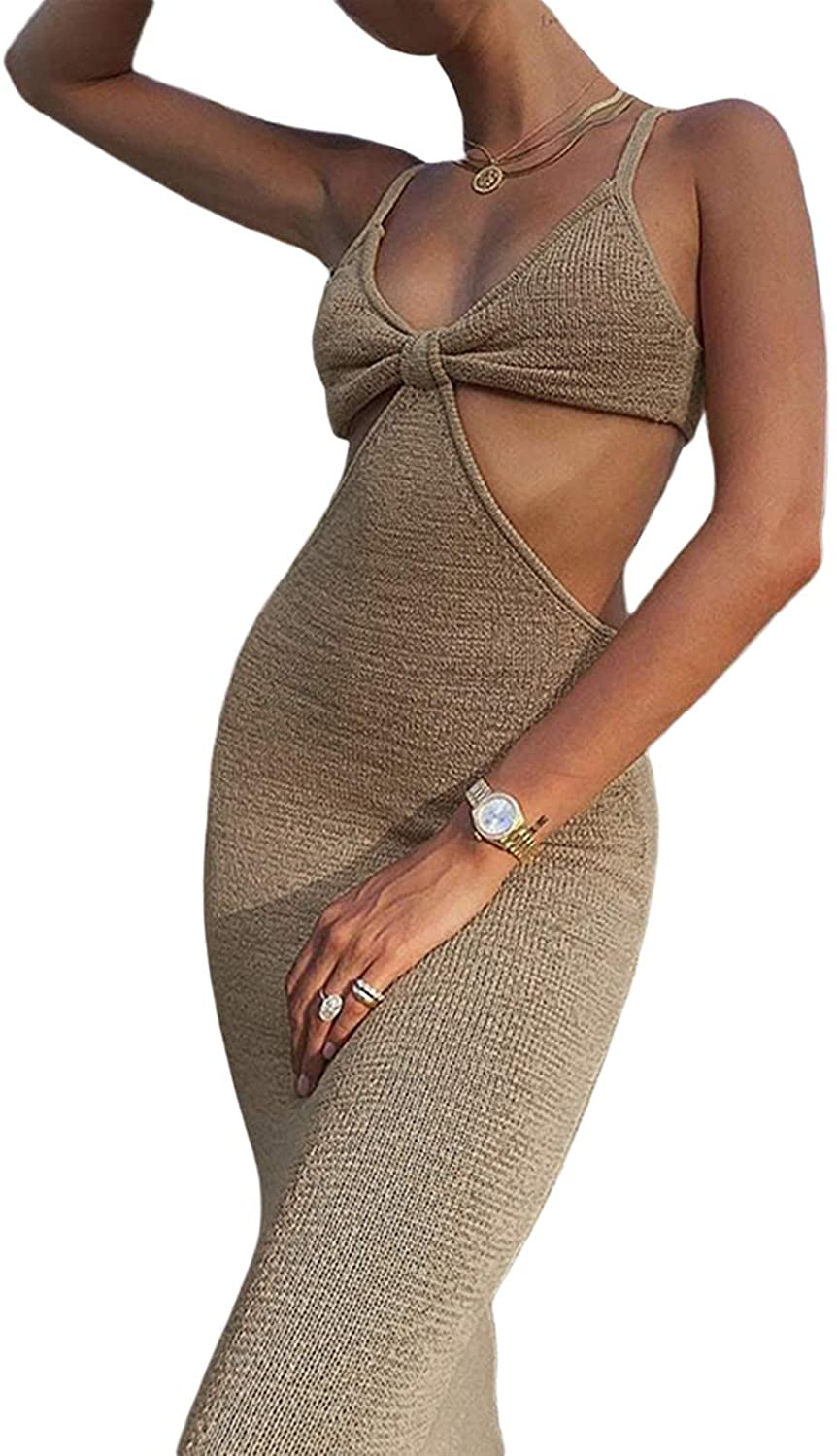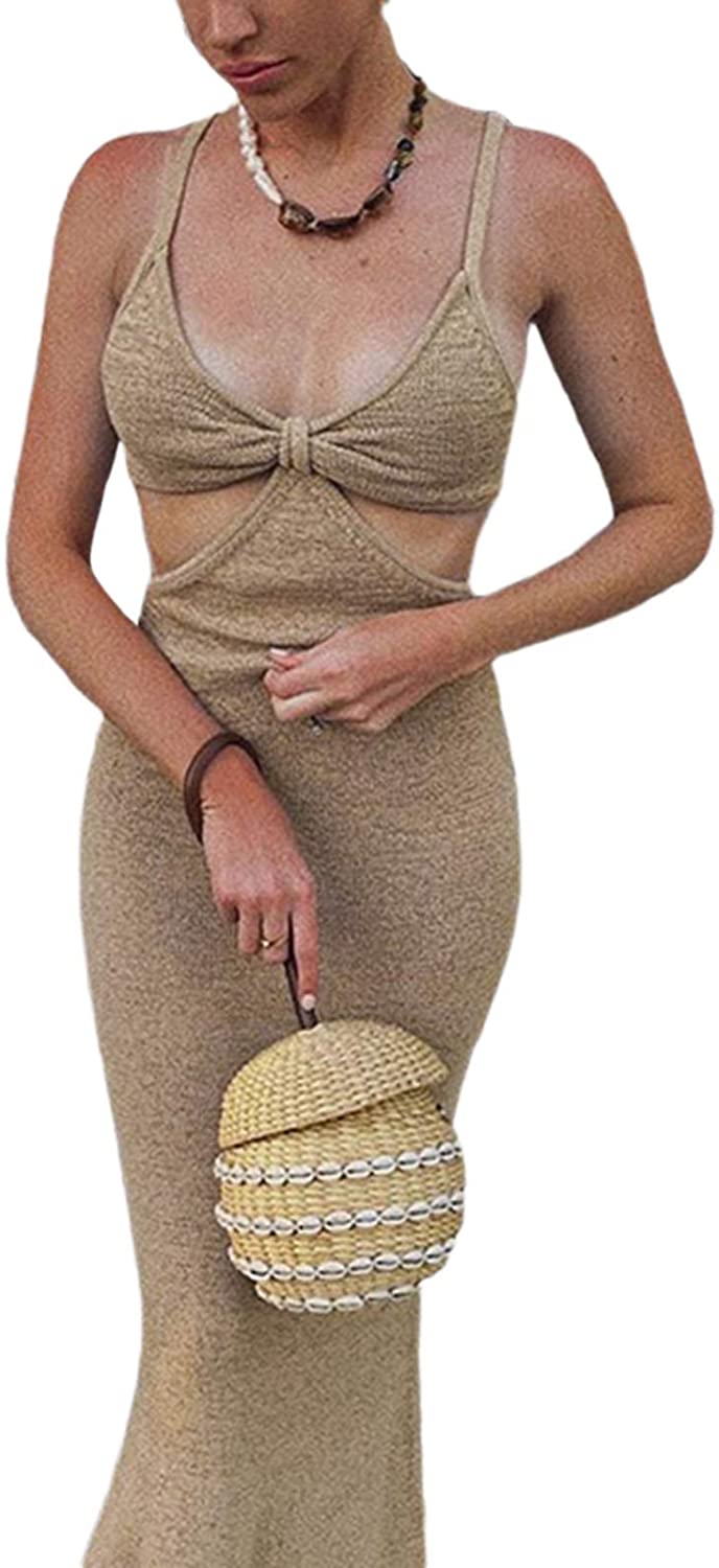 Womens Sexy Knitted Cut Out Spaghetti Strap Long Dresses Halter Neck Backless Maxi Dress Club Party Y2K Streetwear