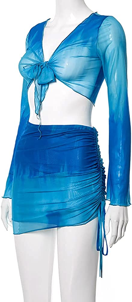 Women's Sexy Long Sleeve 2 Pieces Sheer Mesh Cover Up Dress Crop Top Bodycon Ruched Y2K Mini Skirt Sets
