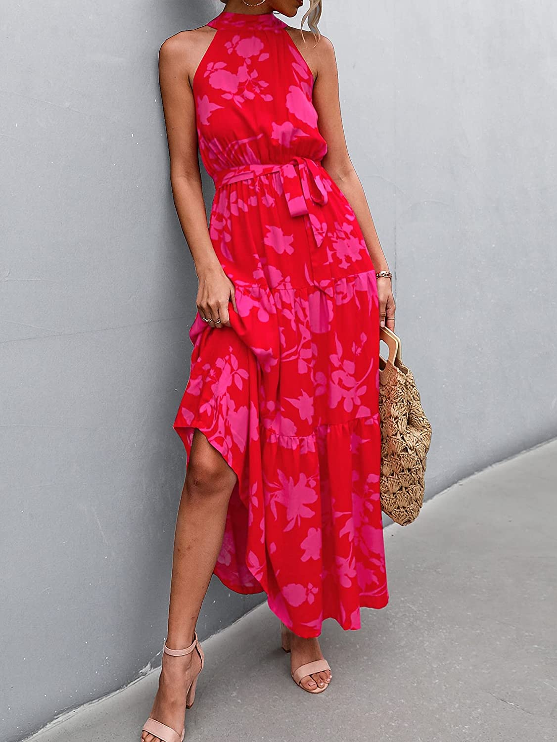 Women's Sleeveless Halter Neck Vintage Floral Print Maxi Dress
