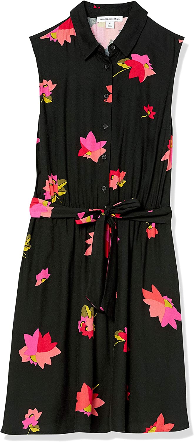 An Amazon brand - This woven sleeveless shirtdress is accentuated with a shirt-tail hem, a button-up front and a spread collar