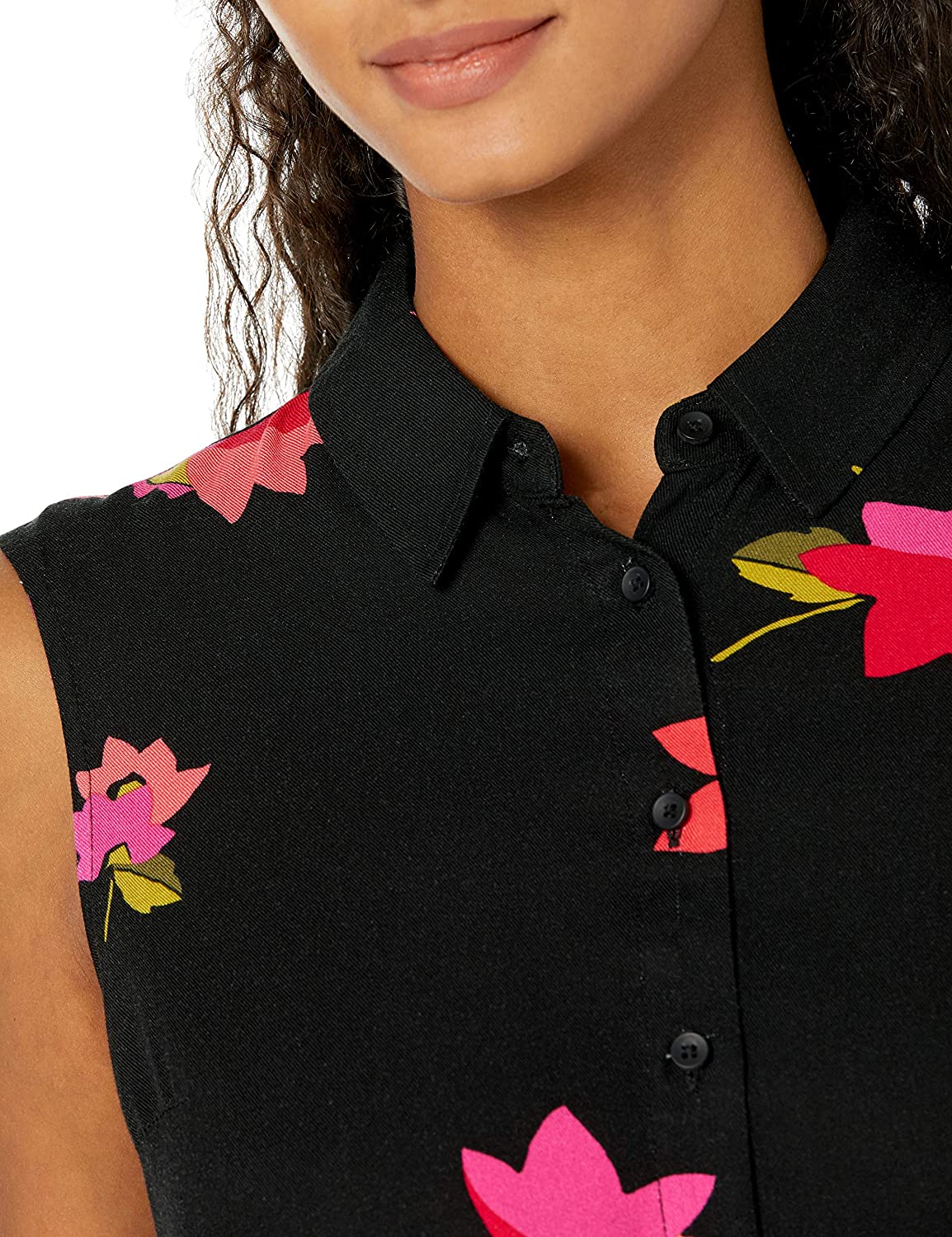 Women's Sleeveless Woven Shirt Dress, Pink/Black, Floral, X-Small