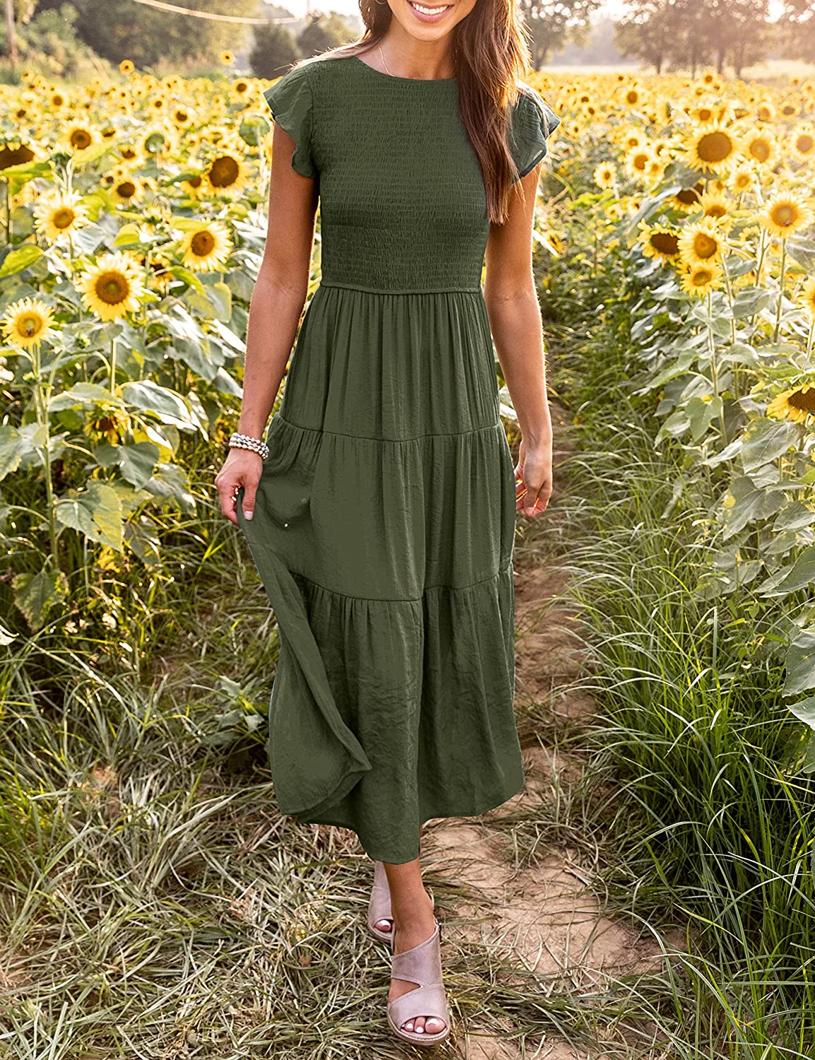 Women's Summer Casual Flutter Short Sleeve Crew Neck Smocked Elastic Waist Tiered Midi Dress
