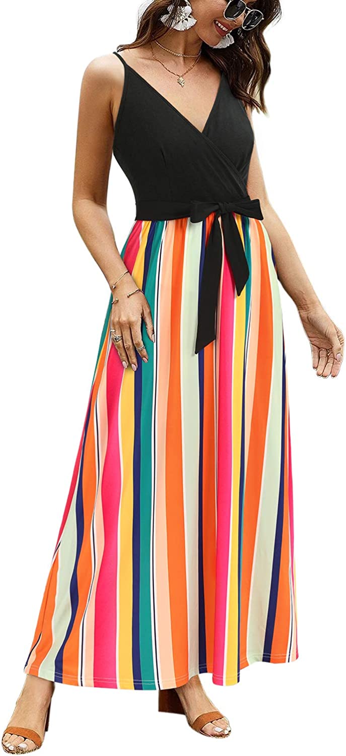 Womens Summer Deep V Neck Floral Adjustable Spaghetti Strap Beach Maxi Dress