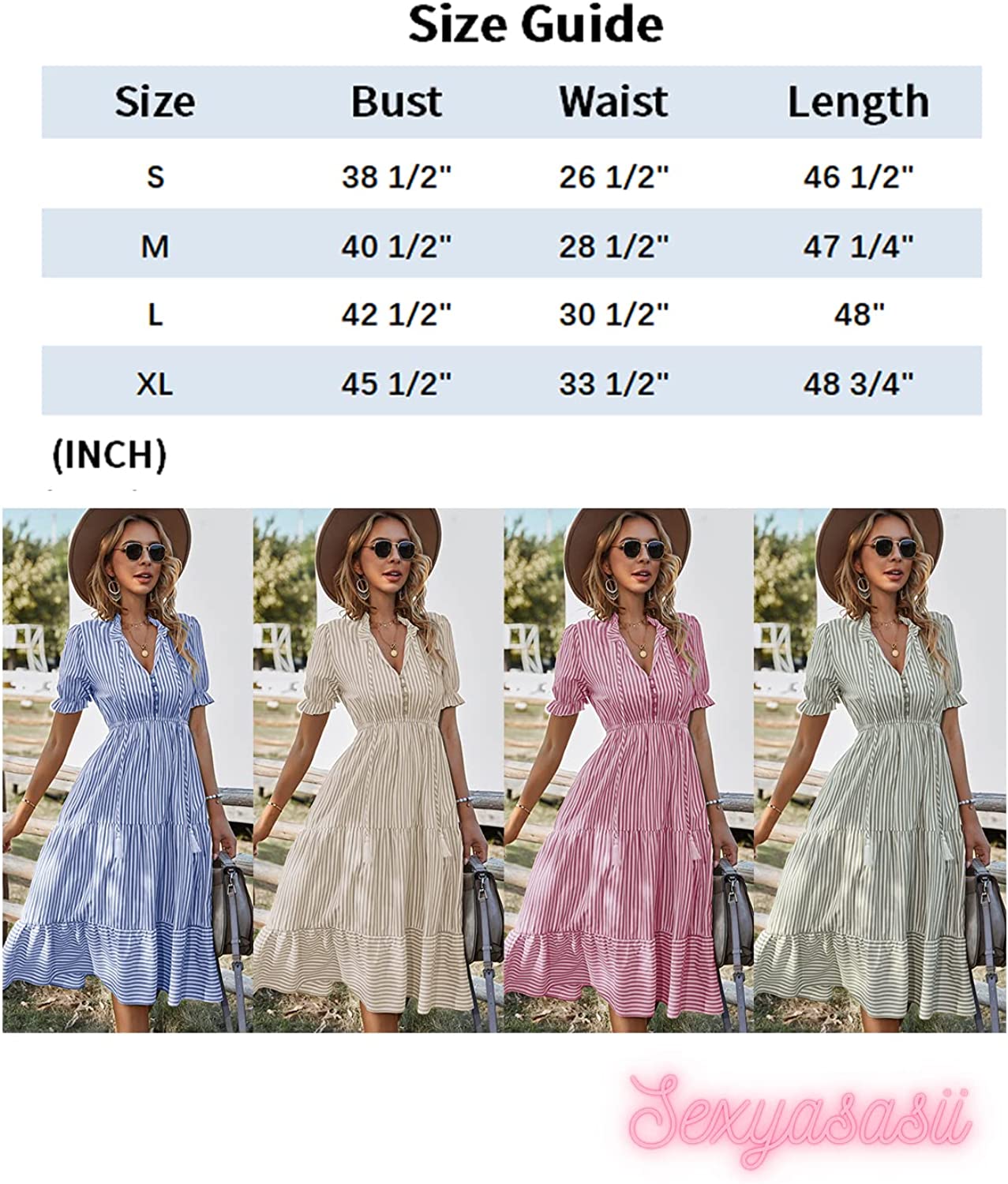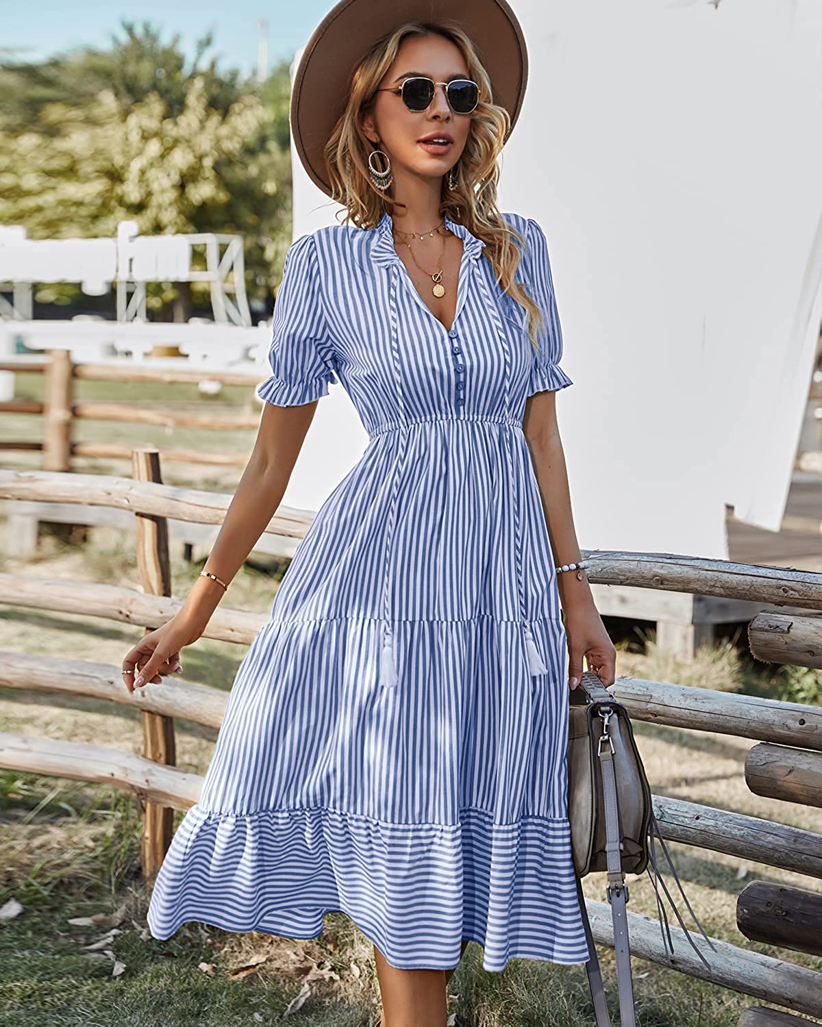 Women's Summer Ruffle Puff Sleeve Dress Short Sleeve V Neck High Waist Casual Loose Striped Midi Dresses