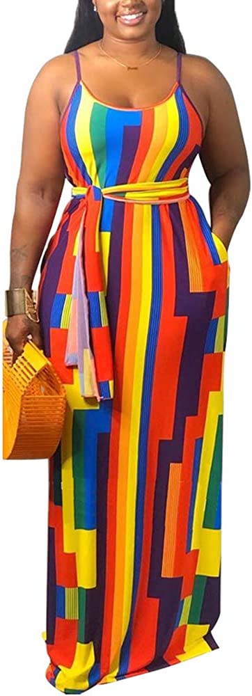 WOOSEN Womens Summer Suspender Maxi Dress Plus Size Striped Printed Sleeveless with Pockets and Belt