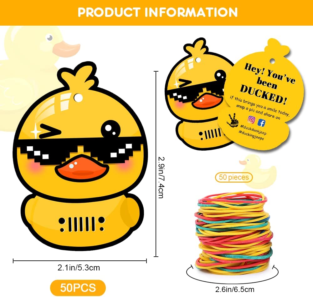 You're Been Ducked ! The cards are used to participate the duck duck jeep game. Color:As picture showsQuanitity:50 PiecesSize:2.9x 2.1inchesPackage includes: 50 x Rubber Bands 50 x Duck Duck cards