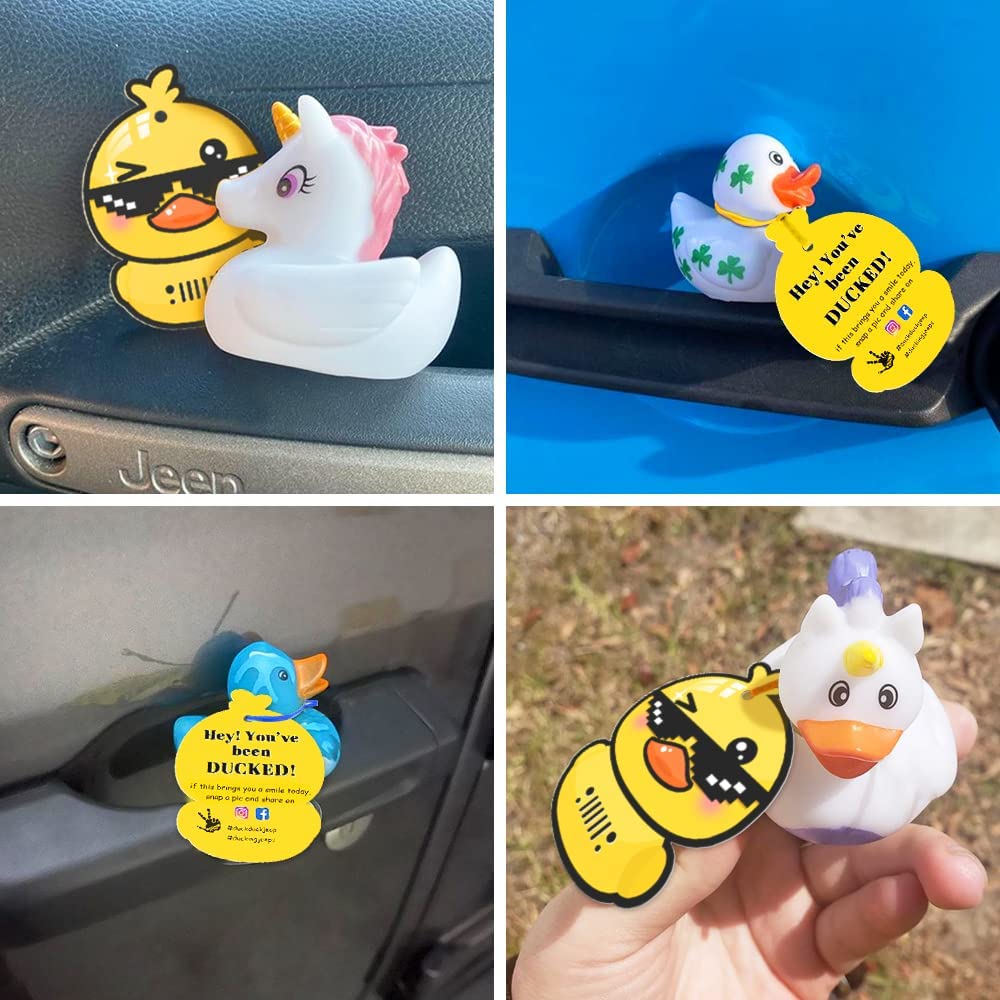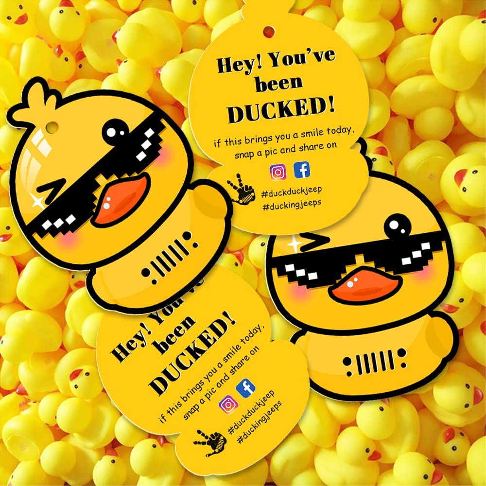 You're Been Ducked ! The cards are used to participate the duck duck jeep game. Color:As picture showsQuanitity:50 PiecesSize:2.9x 2.1inchesPackage includes: 50 x Rubber Bands 50 x Duck Duck cards