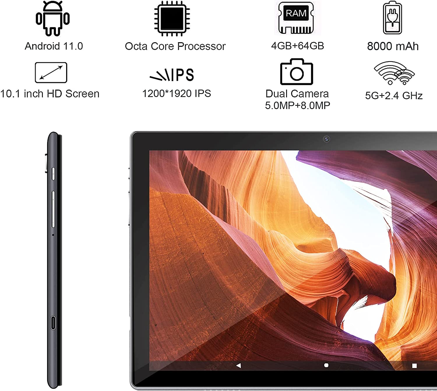 10 inch Tablet, Android 11.0 Tablet, 4GB RAM 64GB ROM Octa-Core Processor, Android Tablet with Dual Camera, 5G & 2.4G WiFi, Bluetooth, HD Touch Screen, Google GMS Certified.