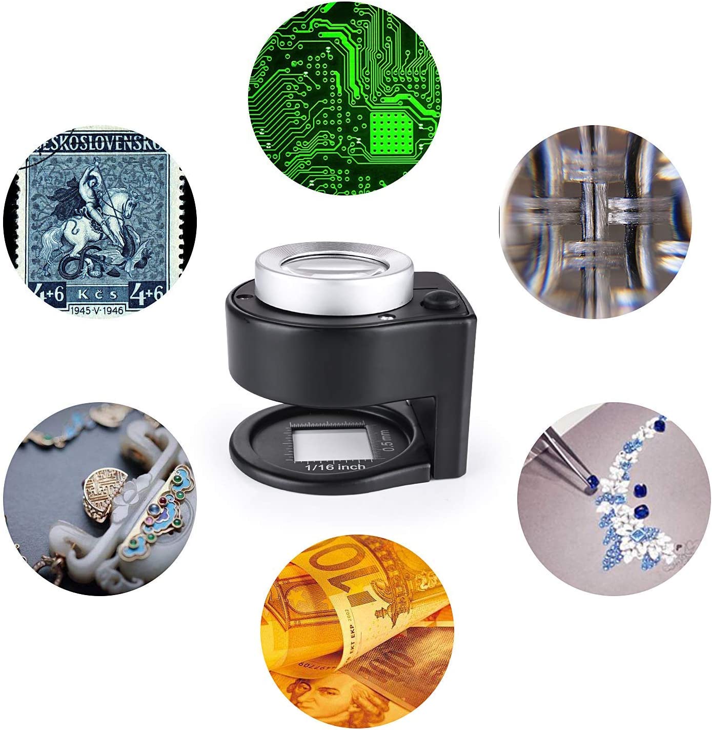 30X Loupe Magnifier with 6 Light,Desktop Portable Metal Magnifier Folding Scale Sewing Magnifing Glass for Textile Optical Jewelry Tool Coins Currency (Black)