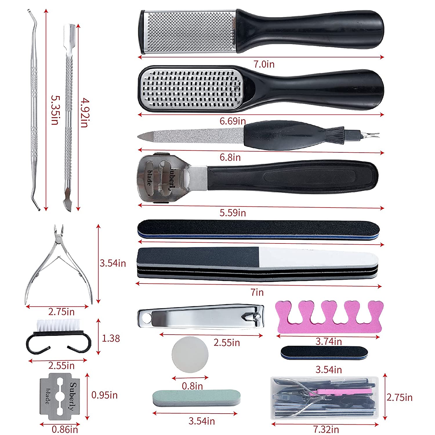 LIGHTWEIGHT DESIGN: The huge foot file has an ergonomic non-slip handle.Whether you are using a foot planer or stainless steel pusher, their handles provide a comfortable grasp and make the whole process easy. SUGGESTIONS FOR USE: It is recommended to use 1-2 times a week to achieve better results, and then use the foot planer tool after drying the water. It is recommended to use a foot planer if the dead skin is particularly thick. (Hint: Even if the safety is the highest, please pay attention when using it.) BEST GIFT: High-quality 23-in-1 pedicure tool is the best choice for you to get professional foot care pedicure at home. In addition, you will have 8 ear cleaning kits.People have learned to use the family pedicure kit, and can also help husbands or wives, children, parents pedicure, and strengthen the relationship between family members. It will be a perfect gift. 2x double-sided coarse and fine grinding foot files; 1x two-in-one nail file and cuticle trimmer; 5x short nail double-sided polishing strip;3x long nail double-sided polishing strip; 1x stainless steel callus scraper; 3x replacement sharp blades; 1x nail clippers; 1x nail brush;1x Clean Nails;2x toe separators; 1x silicone gasket; 1x dead skin pliers; 1x callus shaver; 1x storage box;5xTraditonal Ear Pick;1x Spiral Ear Pick;1x Spring Ear Pick;1xCleaning Brush; 1x storage box.Different tools to meet your different needs.