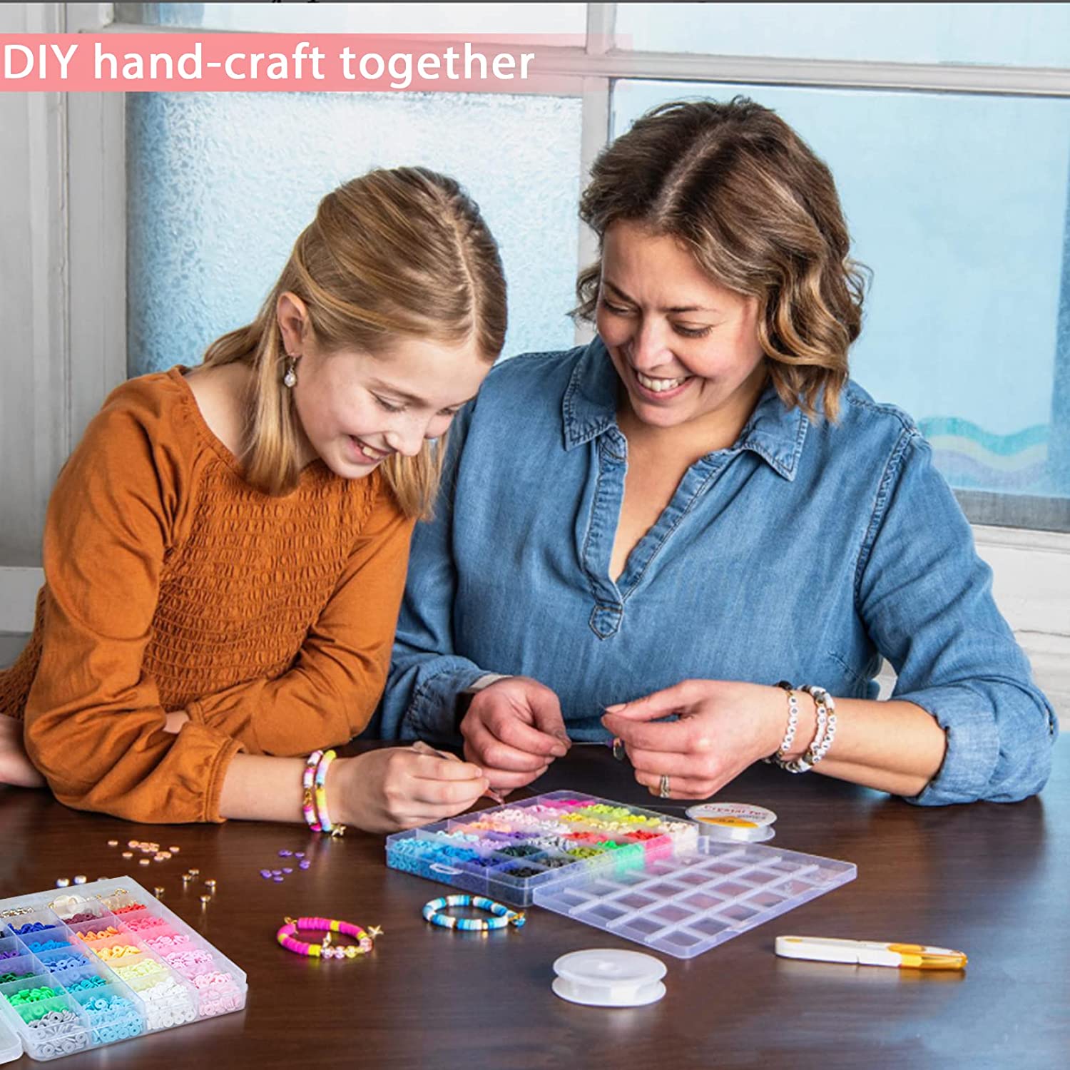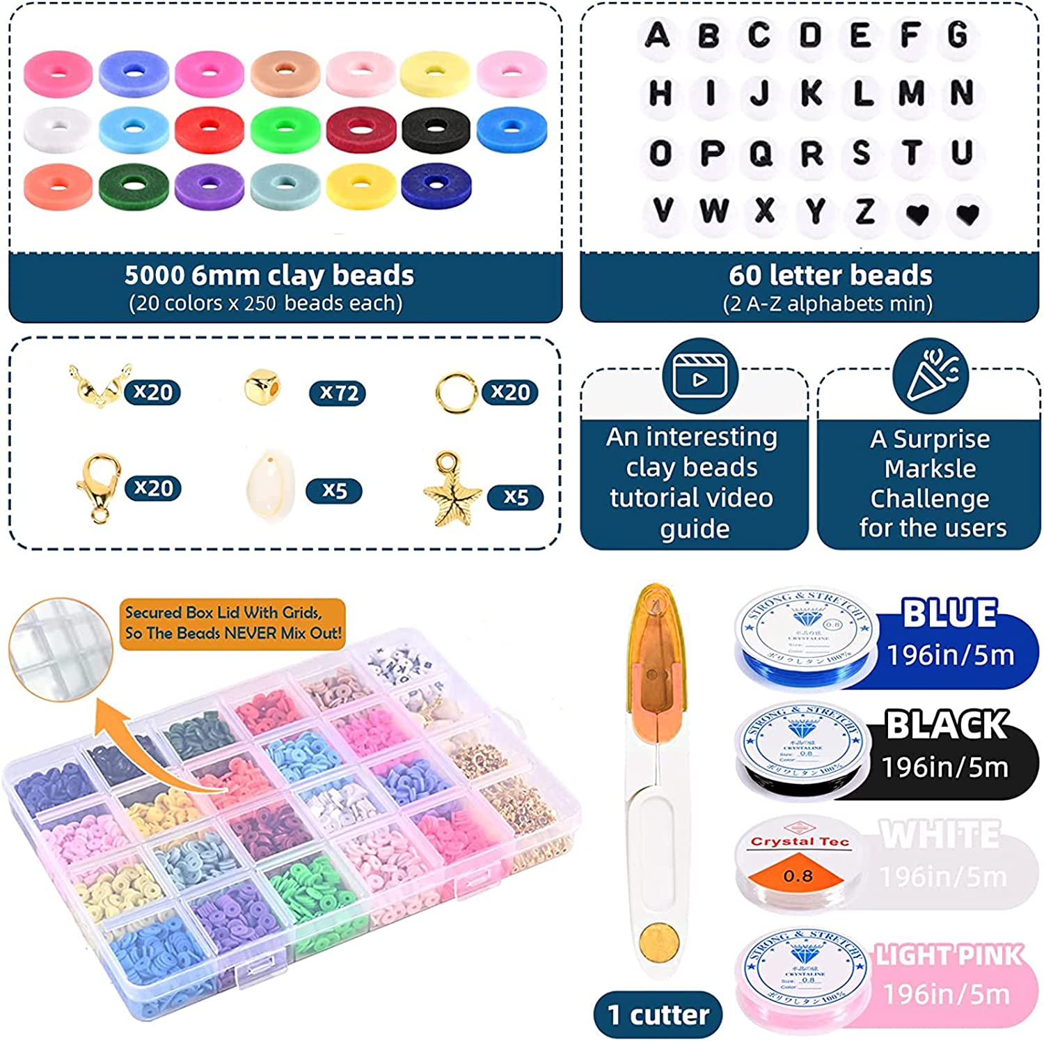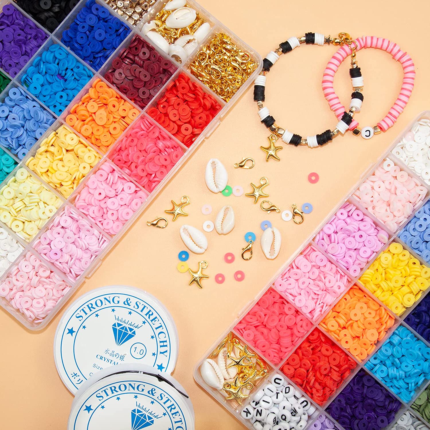 5000Pcs Clay Beads for Bracelets Making Kit, Flat Preppy Heishi Beads Polymer Clay Beads with Letter Beads, Pendant Charms and Elastic Strings for Jewelry Making Kit Bracelet Necklace Gift for Girls