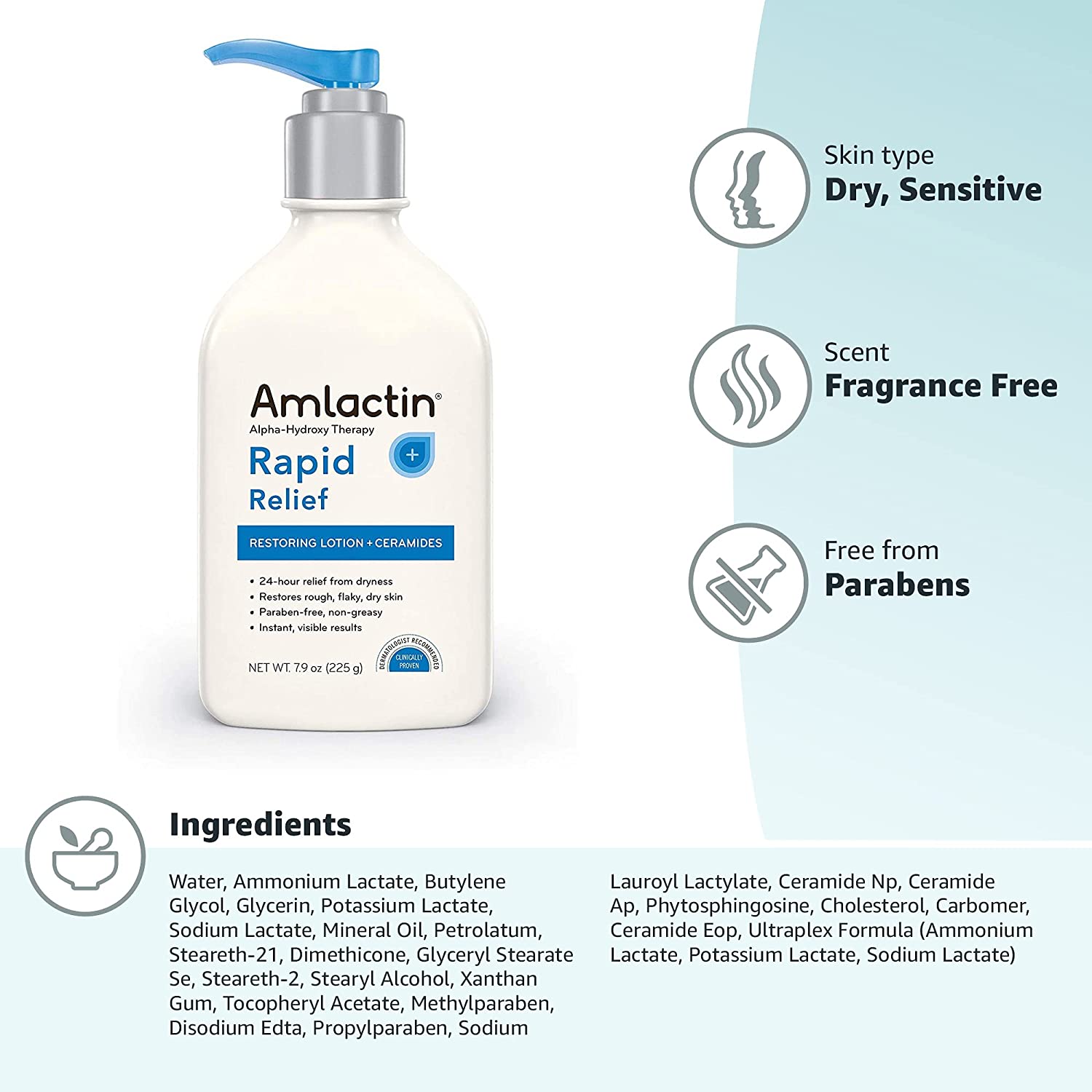 Experience 24-hour relief from dryness with AmLactin Rapid Relief Restoring Body Lotion. Formulated with 15 percent lactic acid, plus three ceramides, this exfoliant lotion helps lock in moisture for visibly soft skin. A non-greasy body moisturizer lotion, AmLactin Rapid Relief Restoring Moisturizing Lotion for dry skin is also fragrance-free and paraben-free, and instantly transforms your skin's appearance for visibly soft, youthful-looking skin. AmLactin dry skin lotion helps relieve symptoms of skin conditions such as keratosis pilaris and dry skin and comes in a convenient pump bottle for easy application! Help relieve dry skin with AmLactin moisturizers, the Number 1 Dermatologist Recommended Moisturizer Brand with Lactic Acid.