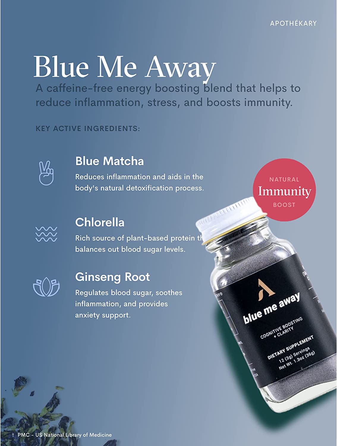 Blue Me Away is a caffeine-free herbal powder blend that boosts mental clarity, provides lasting energy, and helps address stress. Chlorella and Ginseng, two powerhouse adaptogens, help reduce cortisol and aid in the body’s detoxification process. With its creamy and slightly bitter matcha flavor, enjoy this like you would a hot cup of green tea.