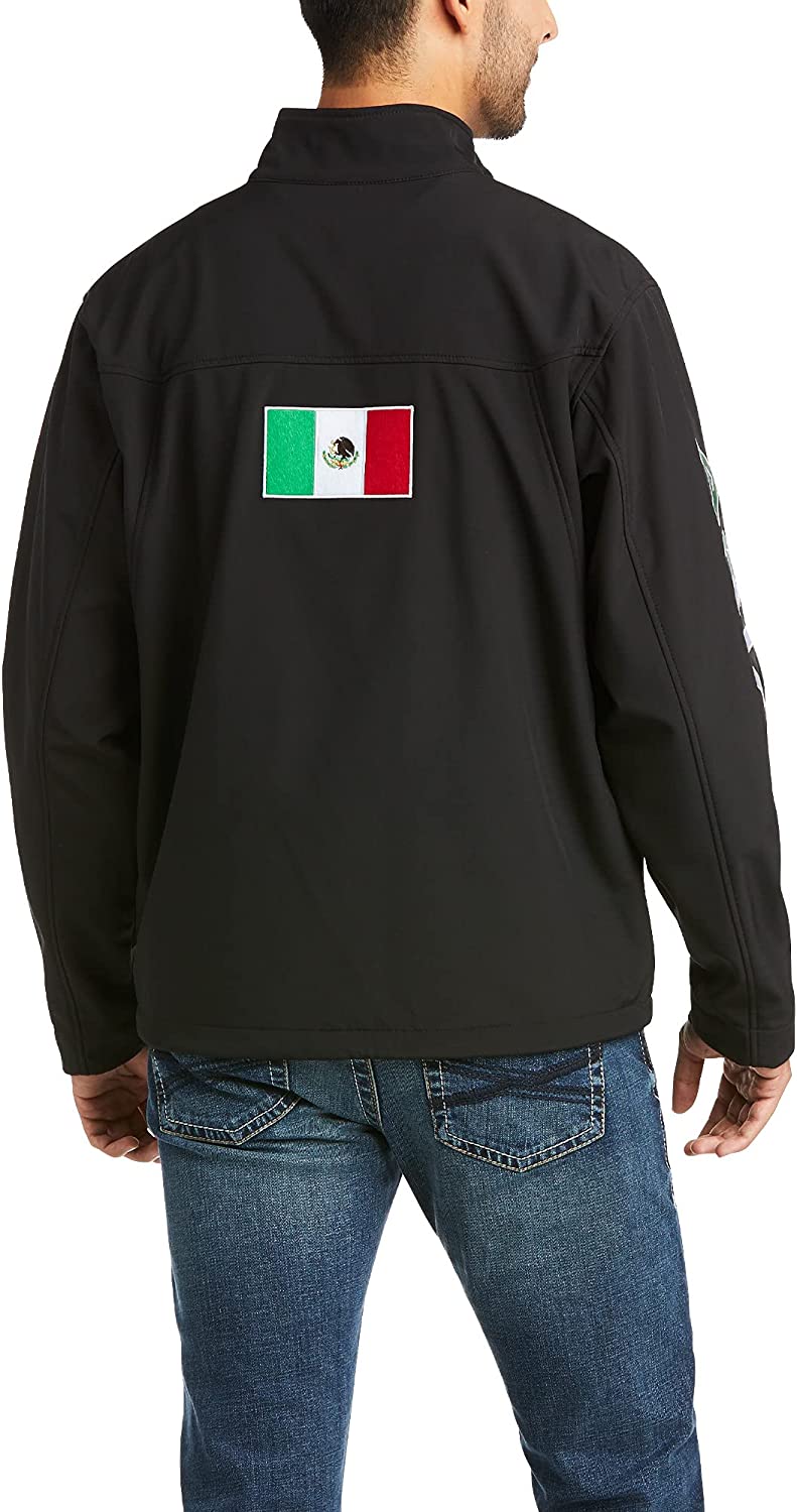 New Team Softshell MEXICO Water Resistant JacketOur smart, sleek Team Softshell Jacket is for the athlete who demands the best. It's warm to the core and cut to perfection so you'll always ride in supreme comfort. This exclusive style pays tribute to Mexico. AriatTEK Cold Series technology keeps body core warm Wind and water resistant garments employ a thin technological coating to block wind and protect from light rain Softshell with microfleece backing Team color blocking Stand collar Zippered hand pockets Ariat branding