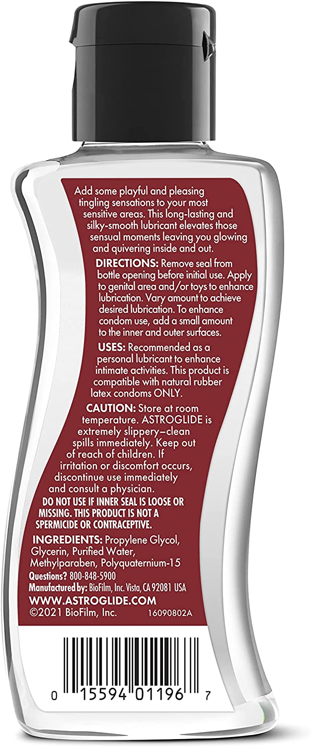 Add some playful and pleasing tingling sensations to your most sensitive areas. This silky-smooth lubricant elevates those sensual moments leaving you glowing and quivering inside and out. Subtle yet satisfying, QUIVER™ provides just a touch of extra playful sensation and magic to take your sexual pleasure up a notch. ASTROGLIDE QUIVER™ is a water-based lube, so it cleans up easily and is great for couples, solo, and use with sex toys. Reduce friction and irritation while adding pleasure and excitement to your intimate playtime. This water-based personal lubricant is also compatible with natural rubber latex condoms.