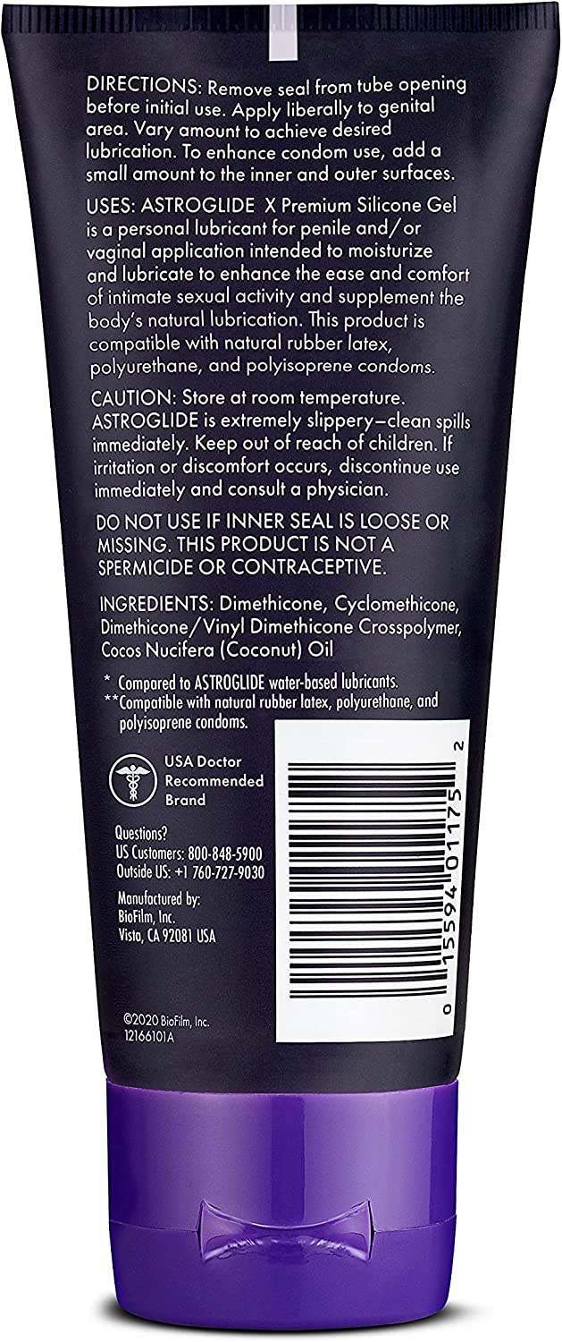 This unique blend of high-quality silicone-based lubrication offers silky smooth satisfaction for sex play in and out of the water. Our lubricant is extremely long-lasting with a silky feel that is never sticky. The natural ability of silicone to resist water lets our lubricant stay slick and work great in settings where other types of lube wash away. Our hypoallergenic formula is a great choice for people with skin sensitivities. Made with coconut oil, ASTROGLIDE’s silicone lubricant gel stands out against other types of lube, both silicone-based and beyond. This lubricant is silky smooth, super long-lasting and works great for sensitive skin – from the shower to the bedroom. Let ASTROGLIDE bring you luxuriously long-lasting lubrication with this no-drip silicone gel.