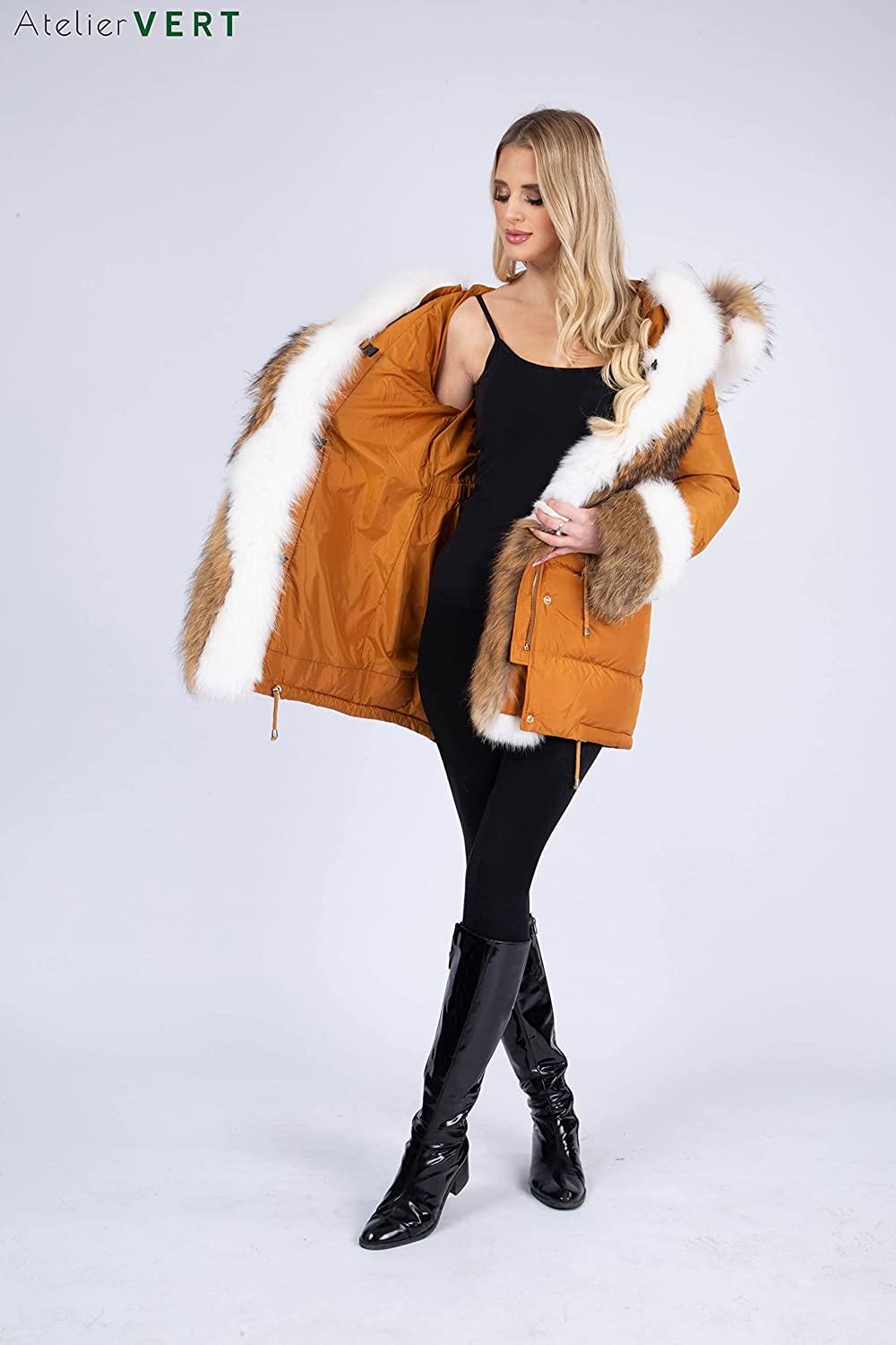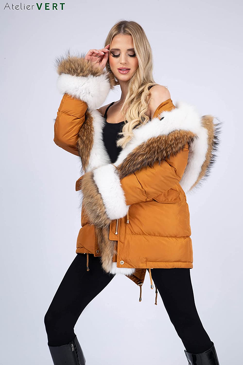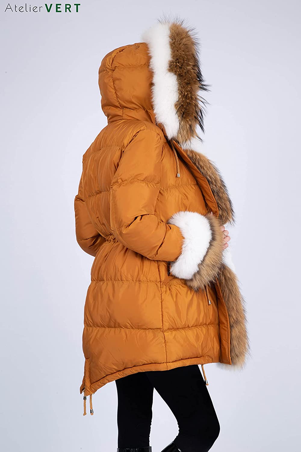 AtelierVert, Women's Inflatable Fox Raccoon Fur Detailed Parka, Women's Fox Fur Parka, Stylish and Luxury Design ATV-105