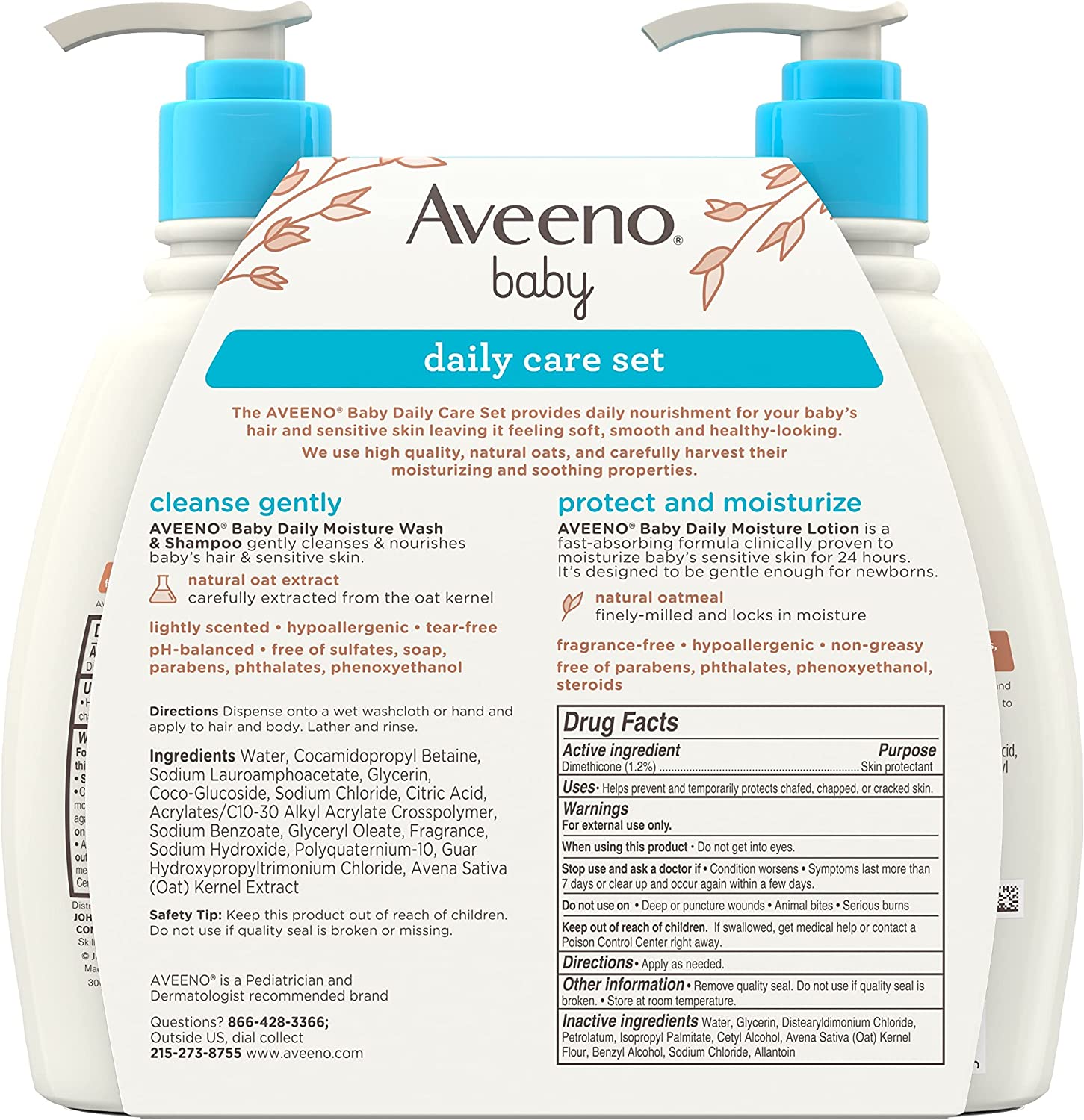Aveeno Baby Daily Care Gift Set features a gentle 2-in-1 cleansing baby wash & shampoo and a daily moisturizing baby body lotion specially designed for baby's delicate skin. The Aveeno Baby Wash & Shampoo with natural oat extract is a gentle, yet rich lathering bath wash designed for tear-free cleansing of both sensitive skin and hair. The hypoallergenic tear-free formula is pH-balanced and free of soap, sulfates, parabens, phthalates and phenoxyethanol. It rinses clean, leaving a soft, fresh fragrance. After bathing, soothe and moisturize baby's skin with Aveeno Baby Daily Moisture Body Lotion. Containing natural oatmeal blended with dimethicone skin protectant, the fragrance-free lotion formula nourishes and helps protect baby's delicate skin. The non-greasy formula absorbs quickly and moisturizes for a full 24 hours. Plus, the hypoallergenic lotion is free of parabens, phthalates, steroids and phenoxyethanol. Aveeno is a pediatrician and dermatologist recommended brand.