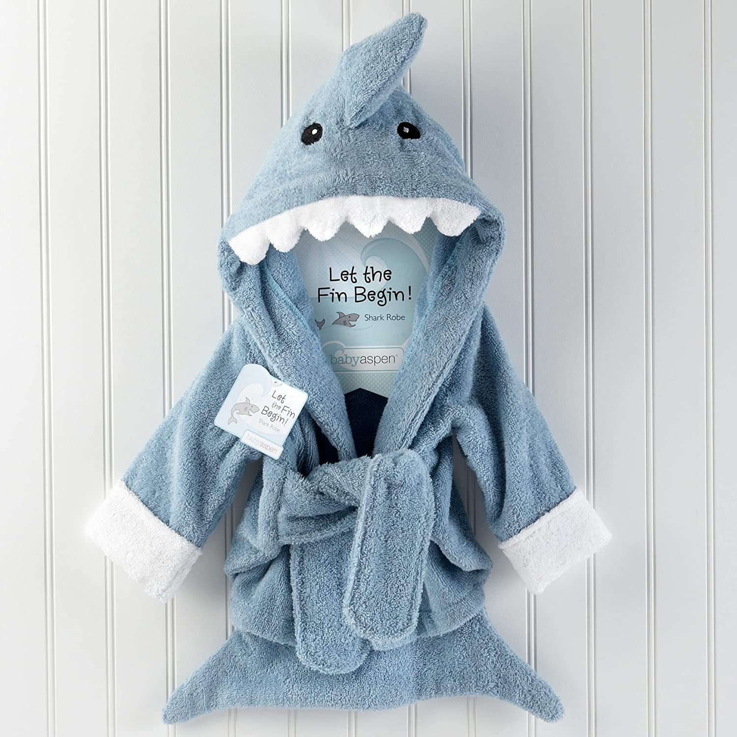 Features and facts: ""Let the Fin Begin"" Terry Shark Robe blue terry robe with white cuffs, two terry ties in front, a hood with smiling, white shark's teeth, appliqued black eyes and a dorsal fin accent. Sharks Machine-wash and dry (low). Size 0-9 months.