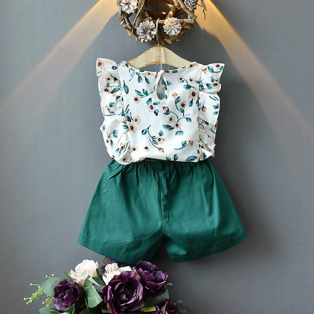 Baby Toddler Girls Summer Outfits 2-7 Years Kids Flower Print T-Shirt Sleeveless Top Belt Shorts Pants Set