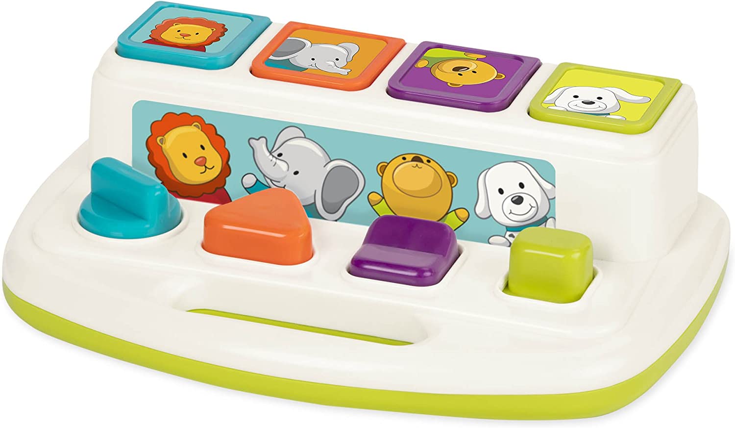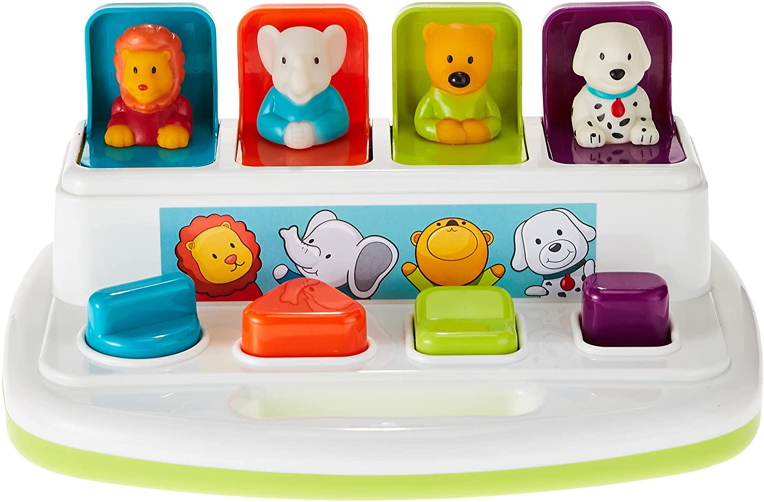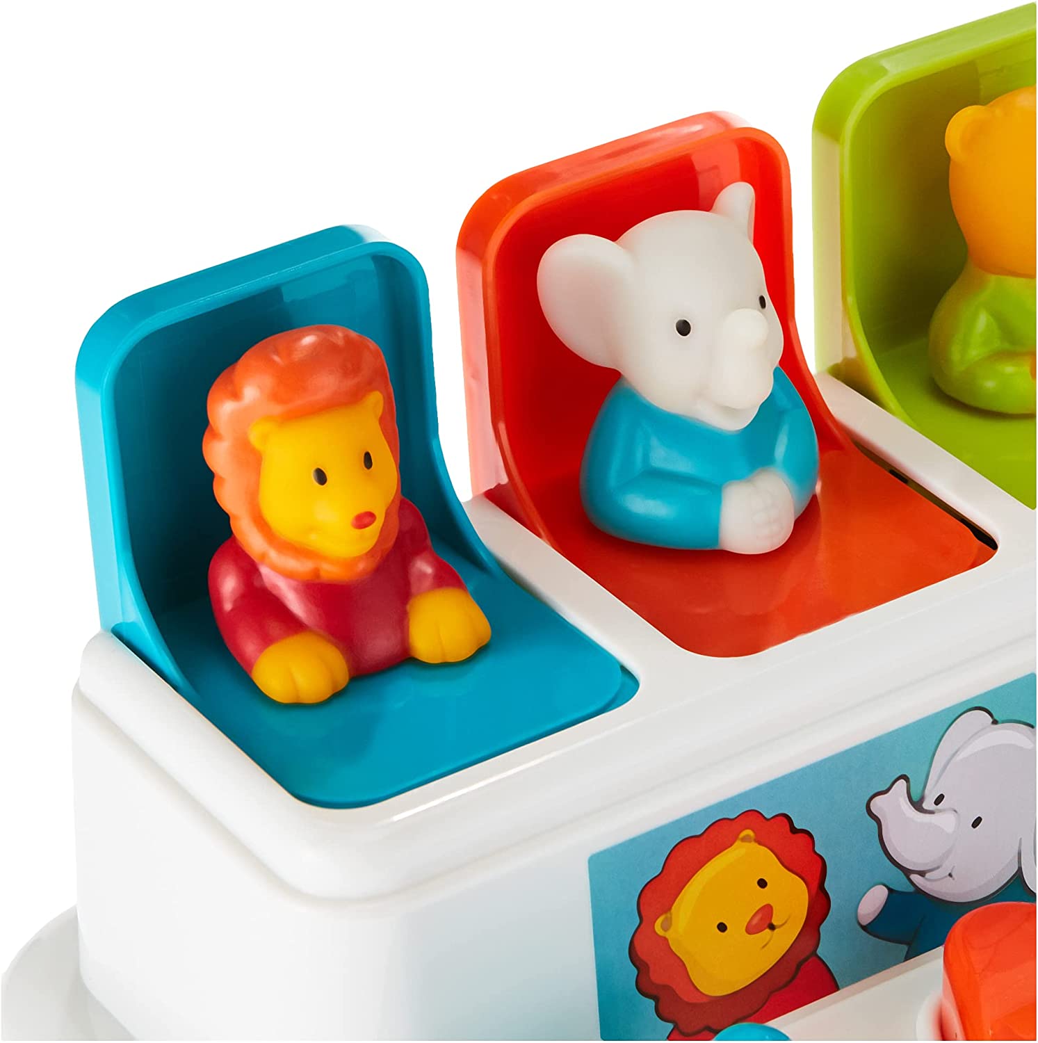 the pop-up pals from Battat is a hands-on, toddler and baby pop up toy with 4 friendly animals! Watch your child explore and discover animals, shapes, colors, and actions. Push, turn, press or slide for a rewarding surprise! Colorful animals pop up for a little cause-and-effect action! This pop-up activity toy is easy to bring anywhere with the built-in handle. Build strong motor skills, and spend hours of rewarding and educational play with this interactive popping activity center for babies and toddlers. Ready, set, pop!