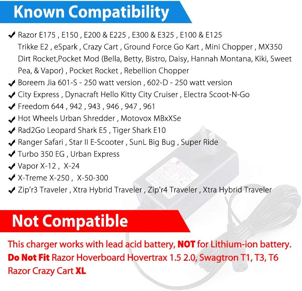 Battery Charger for Razor E200, E300, PR200, Pocket Mod, Sports Mod, and Dirt Quad, Replace for Part# W13112099014