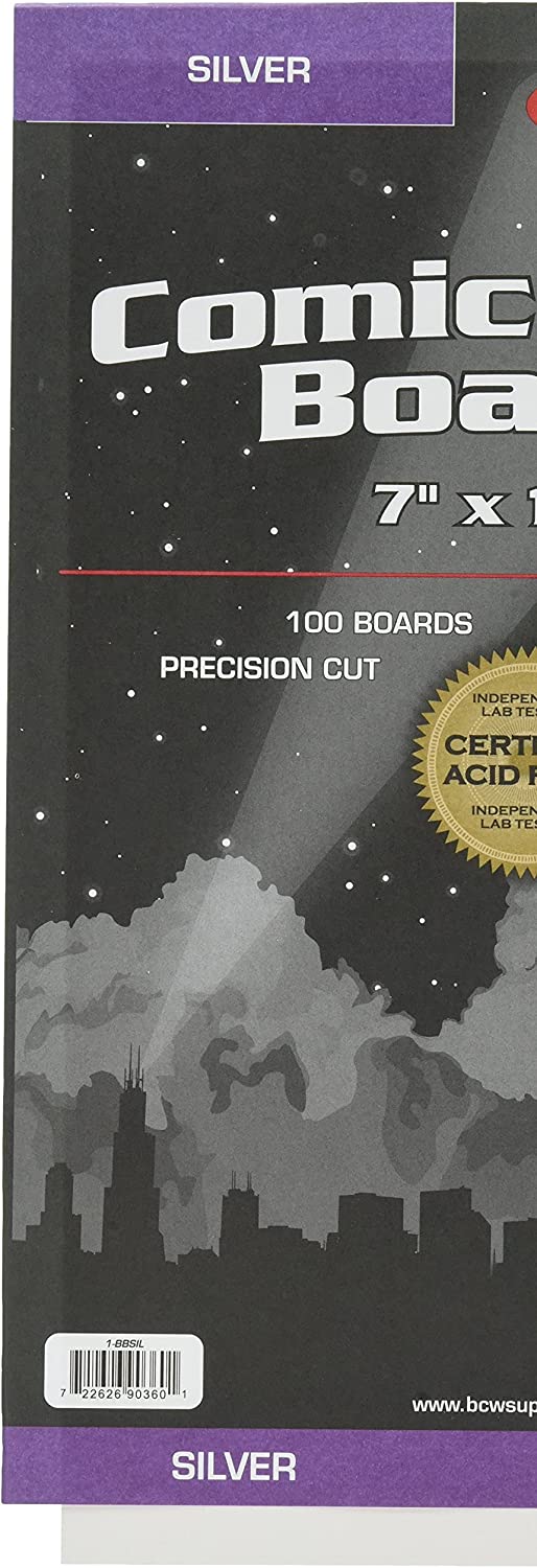 The BCW Silver Comic Backer Boards are made from a full 24 point solid bleached sulfate, coated on one side with a buffered with 3% calcium carbonate and are precision cut to size. Use this item along with silver comic bags to protect and store your collectible comics. se with BCW Current Poly & Mylar Bags (Each Sold Separately).