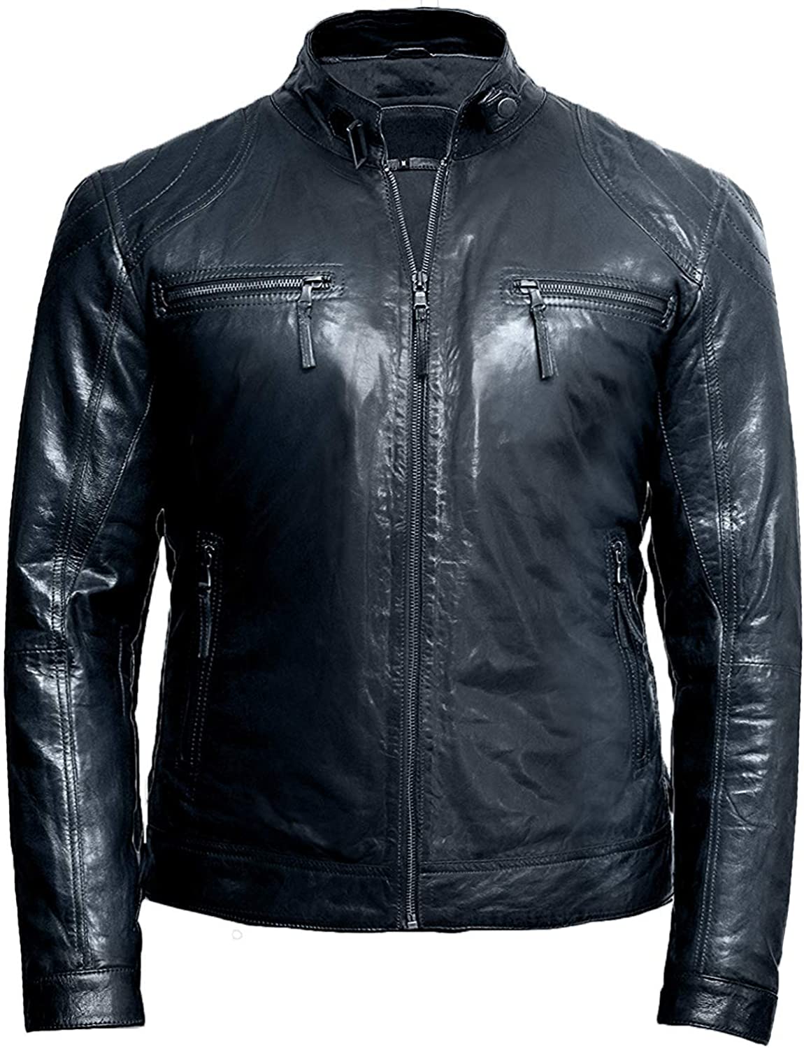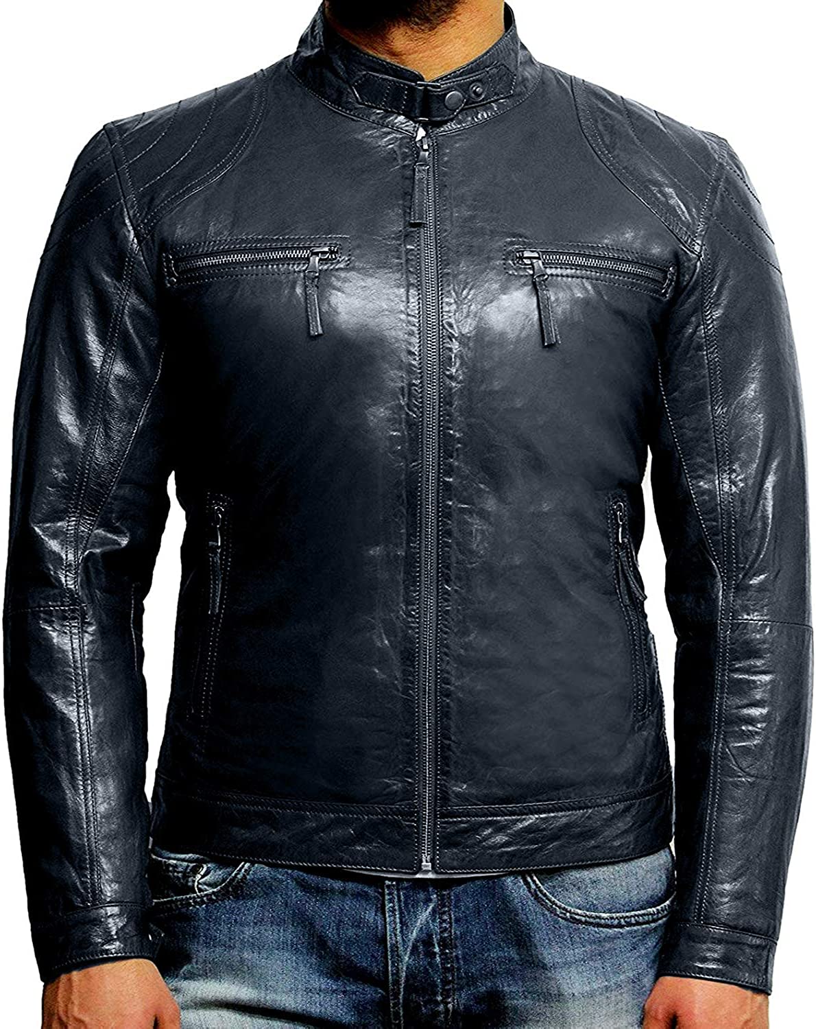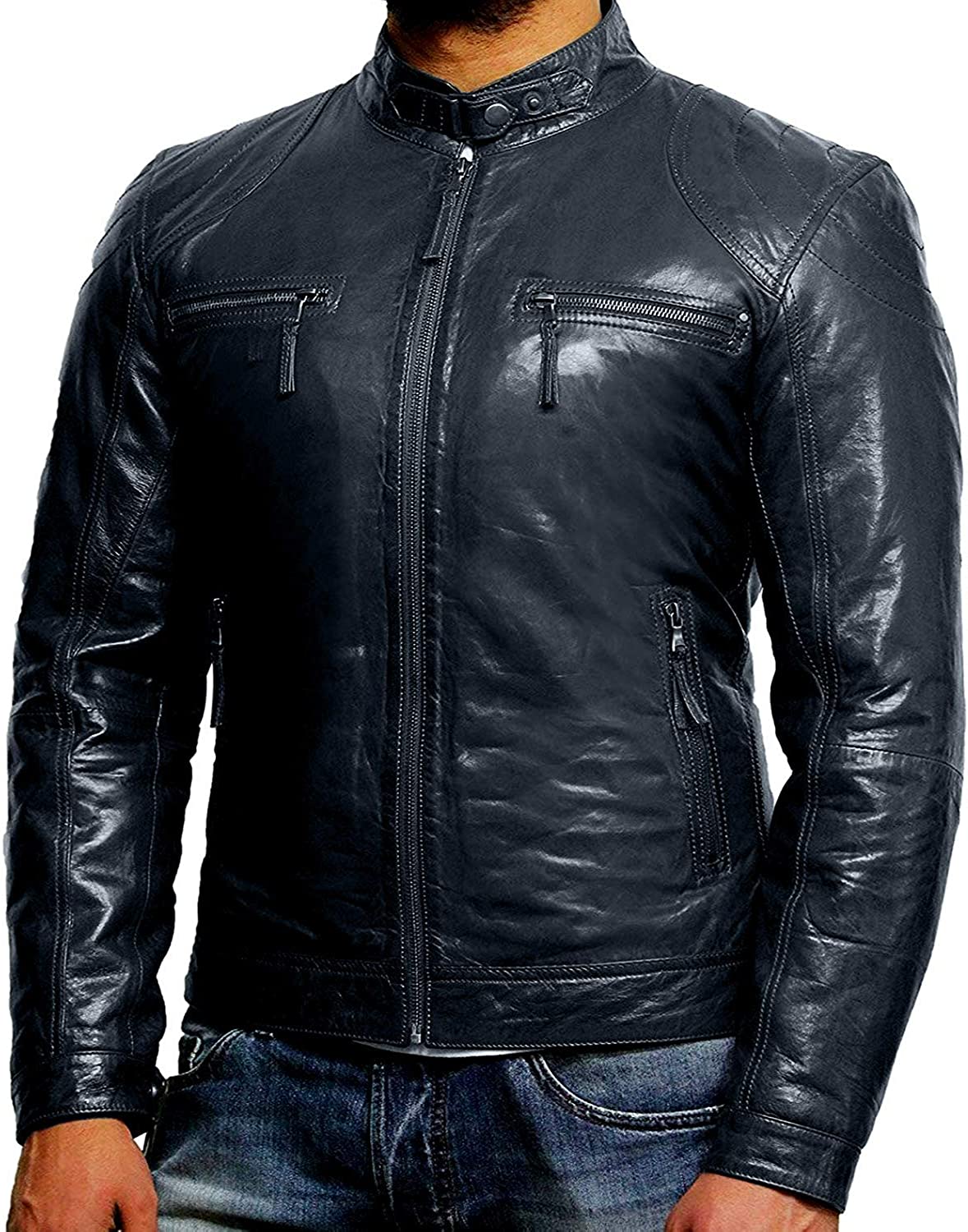 Black Leather Jacket Mens - Cafe Racer Real Lambskin Leather Distressed Motorcycle Jacket