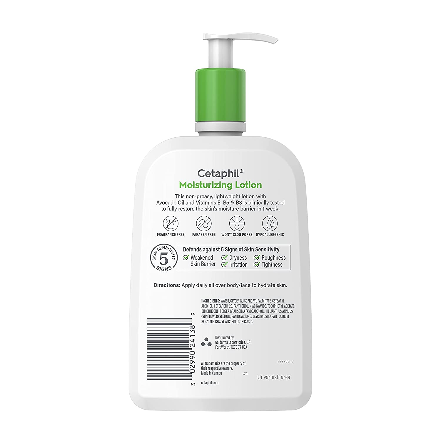 Find skin care that works for you with CETAPHIL Moisturizing Lotion, a lightweight and fast absorbing moisturizer designed to comfort and hydrate all skin types. The unique formulation of skin essential vitamin E and 6 moisturizing ingredients provides instant lightweight hydration that leaves skin soft and smooth. And now formulated with a new blend of key ingredients: hydrating glycerin, panthenol (vitamin B5) to hydrate, soothe and preserve the skin barrier, and niacinamide (vitamin B3) to help smooth skin texture and retain skin moisture barrier. Water binding agents deeply replenish the skins moisture and prevent moisture loss, providing long lasting 48 hour hydration that completely restores the skins moisture barrier in one week, helping to defend against 5 signs of skin sensitivity. Fragrance free, lanolin free, paraben free and sulfate free, this gentle lotion is clinically tested for even the most sensitive skin. Treat your skin right thanks to the gentle, non-comedogenic formula, providing instant, everyday moisturizing care that leaves skin immediately feeling soft, smooth and replenished.