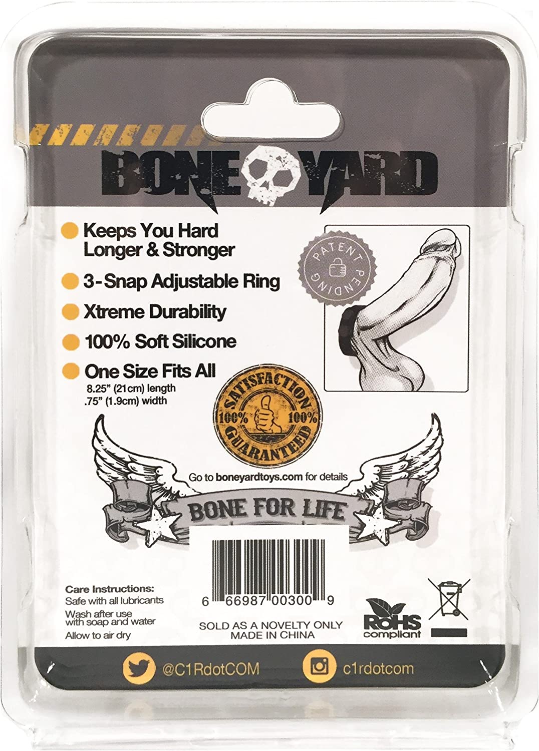 These must-have man toys are designed with superior materials and production thus increasing both comfort and lifespan. The powerful and iconic Boneyard-branded design has a sleek soft touch silicone finish and features a superior and durable stretch. The medical grade 100% silicone snap rings come with 3 snaps on one end and 2 on the other giving the wearer 4 sizing options to find the correct size. Traditionally snap rings are made of uncomfortable hard stitched leather or rubber and until now have never been attempted to be crafted from soft touch silicone. Unique to themselves, these rings synergize with the wearer, providing endless comfort when wearing under your jeans to show off that perfect bulge. You can also be assured that they will withstand the punishment of your longest play sessions time and time again.