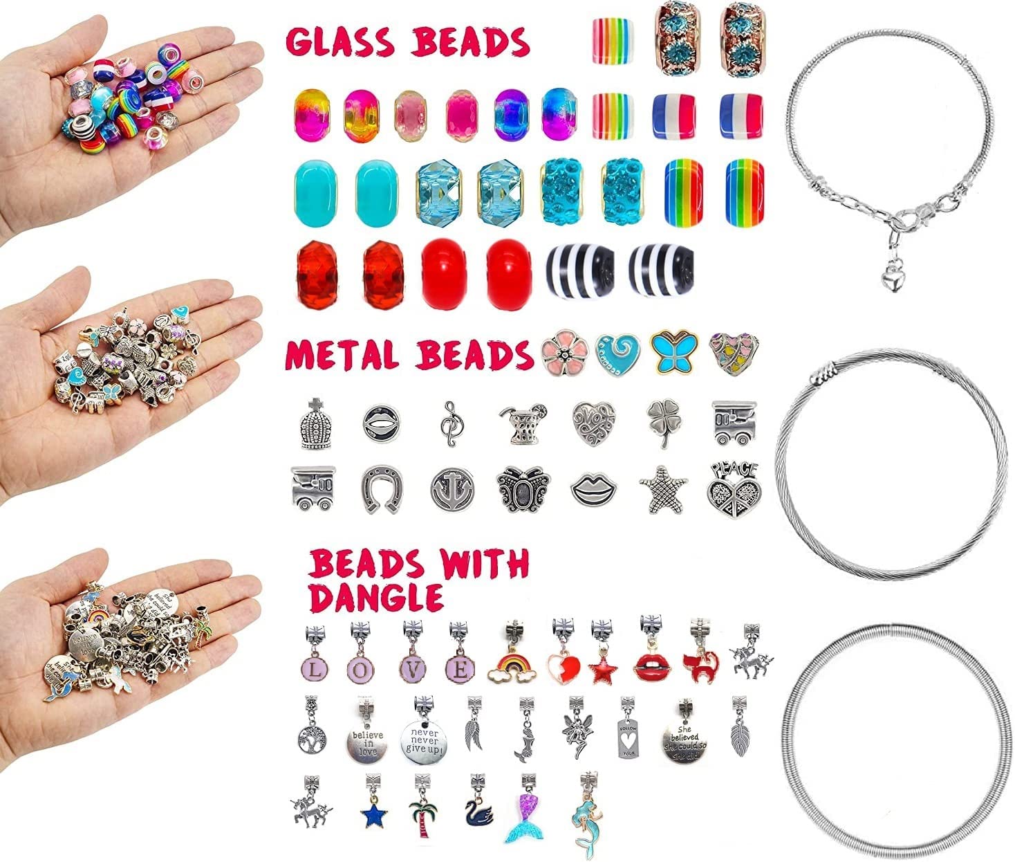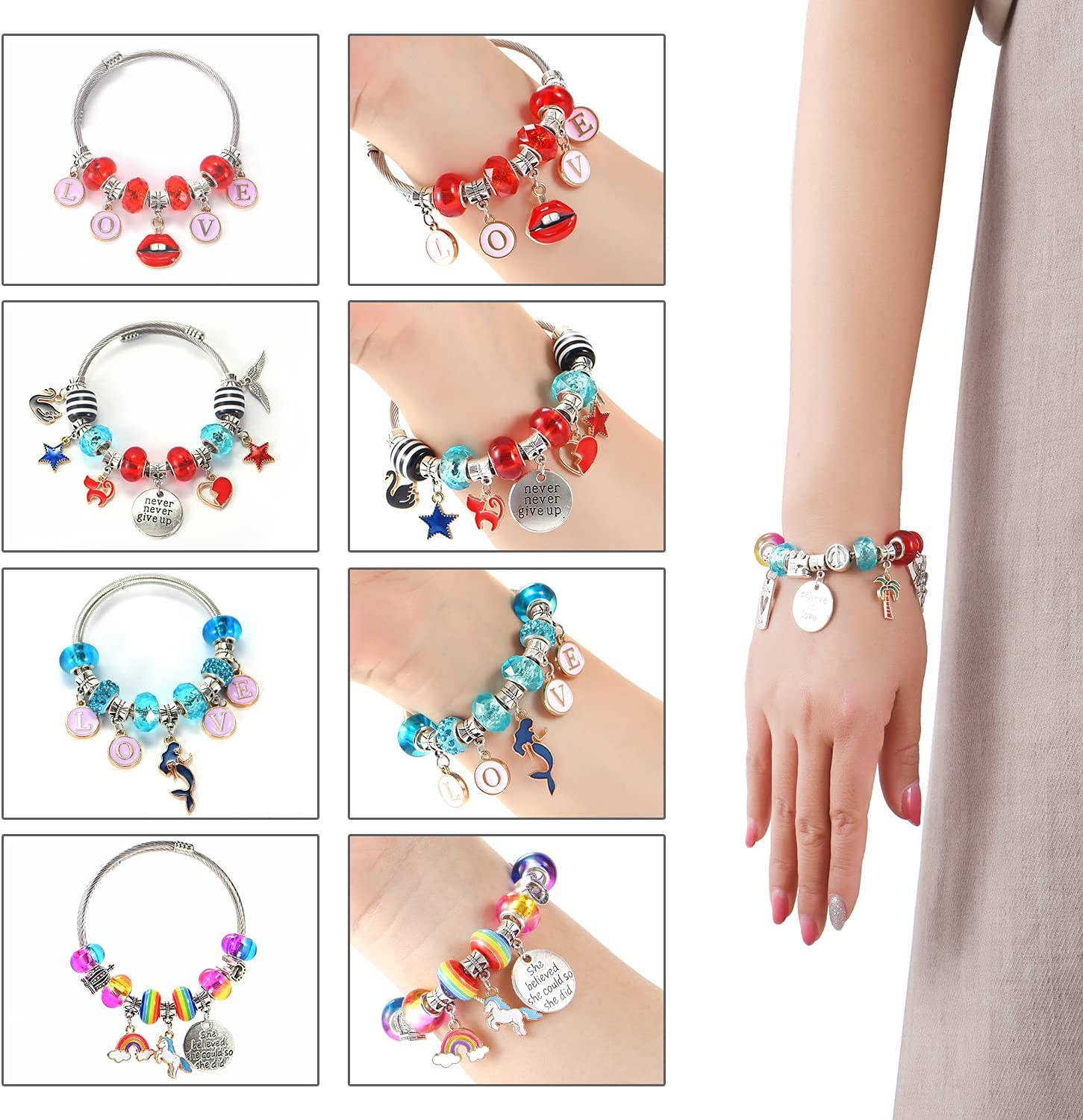 Package include: 16x European big hole beads, 26x Charm and Pendants , 26x Colored beads, shamballa, rainbow, crystal beads 3x Snake chain bracelet and 3 Necklace Cords