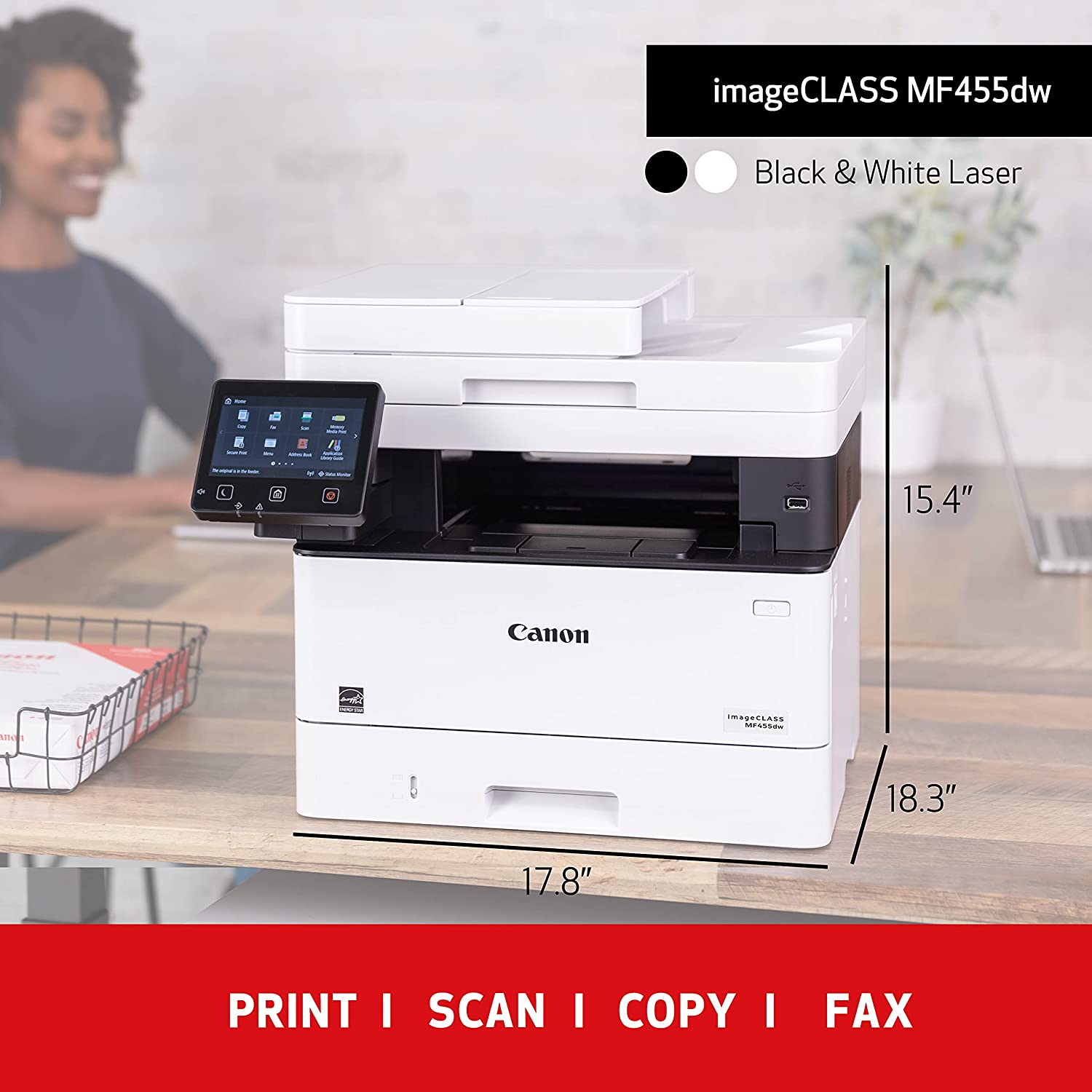 Designed for small and medium-size businesses, the Canon imageCLASS MF455dw model balances speedy performance, minimal maintenance, and the ability to add an extra paper tray. A 5" color touchscreen delivers an intuitive user experience and can be customized by a device administrator to help simplify many daily tasks.