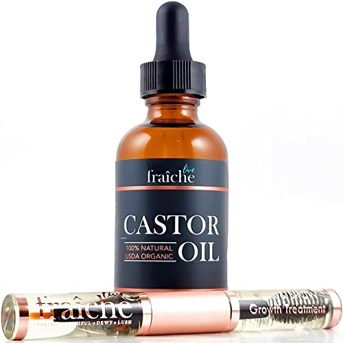 Castor Oil (2oz) + Filled Mascara Tube USDA Certified Organic, 100% Pure, Cold Pressed, Hexane Free by Live Fraiche. Stimulate Growth for Eyelashes, Eyebrows, Hair. Lash Growth Serum. Brow Treatment