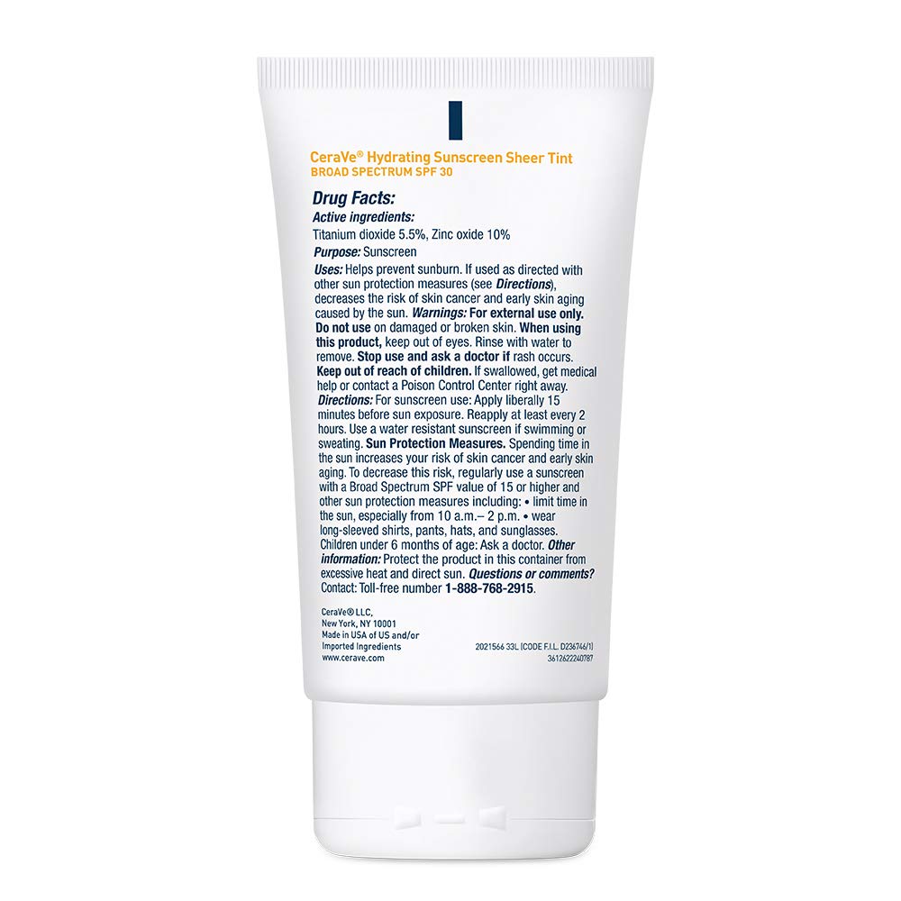 Developed with Dermatologists, CeraVe Hydrating Sunscreen Sheer Tint lotion provides broad-spectrum protection of SPF 30 with 100% mineral filter sunscreen and instantly leaves skin with a healthy glow without any white-cast. 100% mineral sunscreen filters create a protective film on the skin's surface to help reflect UVB and UVA rays. This non-greasy formula provides all day hydration with three essential ceramides that help restore the skin’s natural barrier and lock in moisture.