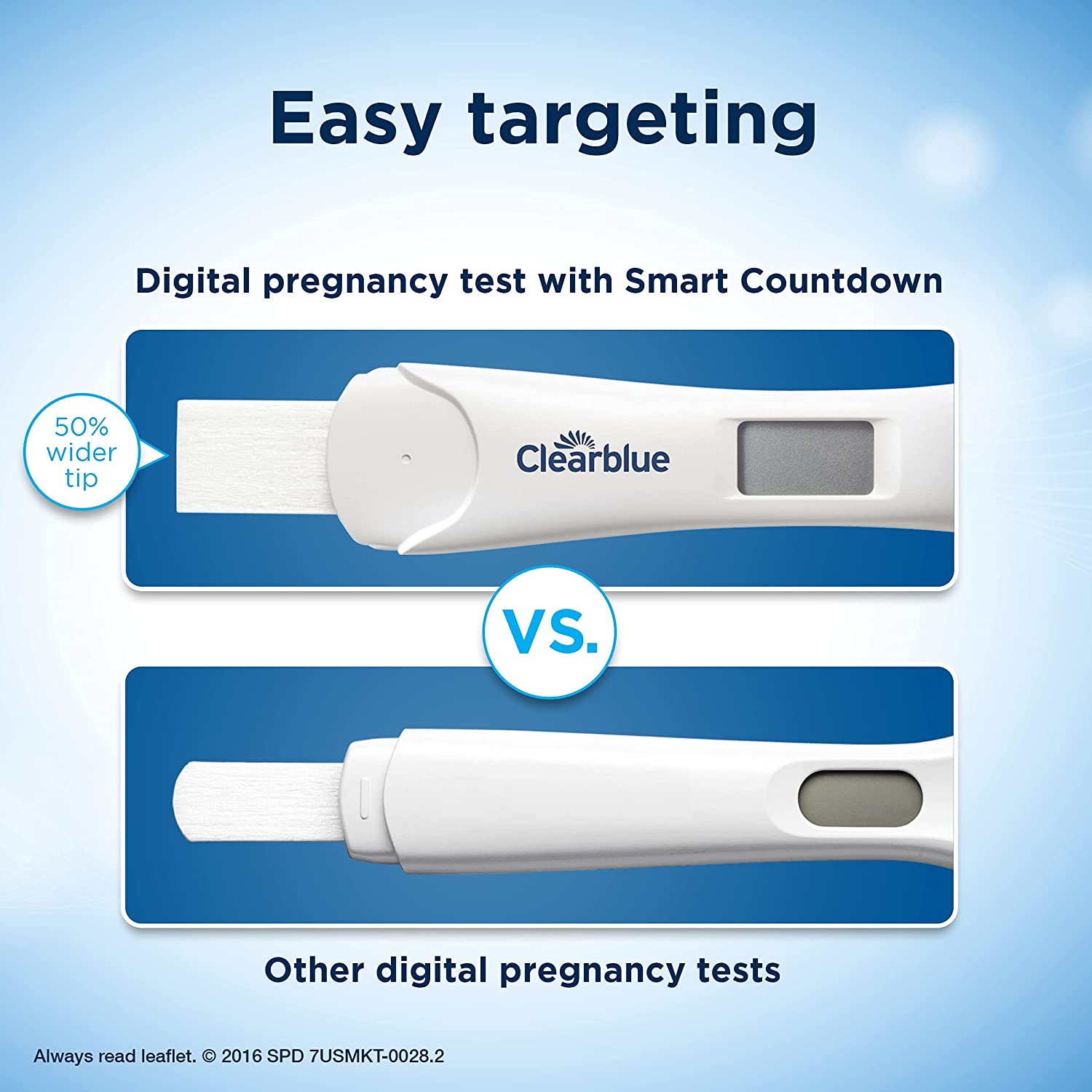The Clearblue Digital Pregnancy Test with Smart Countdown (Prueba de embarazo Digital Clearblue con cuenta regresiva inteligente) is the only test that has a unique progress indicator that counts down to the result and gives you confidence every step of the way until your result is digitally displayed in words. The Clearblue Digital Pregnancy Test with Smart Countdown with its wide tip makes it easy to take the test accurately. The unique Floodguard Technology helps reduce the #1 reported cause of user error by over 70%(4) by keeping excess urine from flooding the test strip. The Clearblue Digital Pregnancy Test with Smart Countdown gives you accuracy and reassurance while you wait for your result.