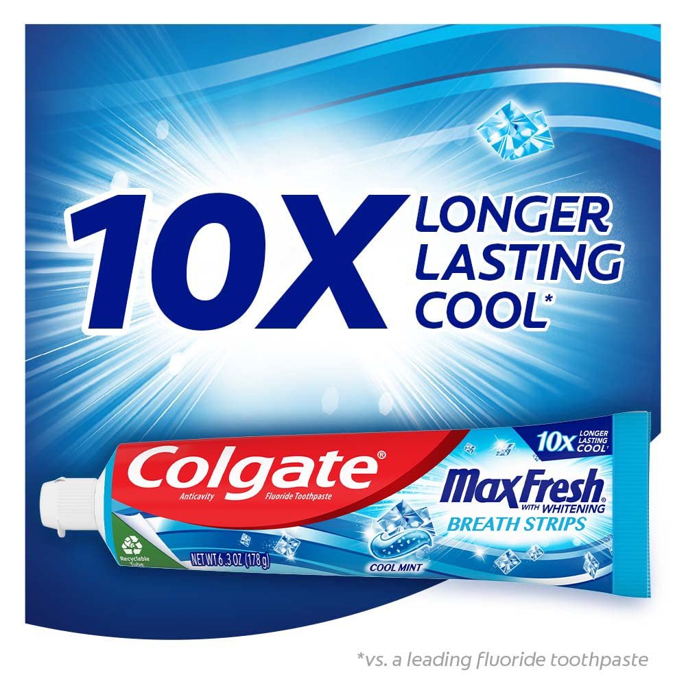 Colgate Max Fresh with Whitening Toothpaste has 10X longer lasting cool*, so you can breathe confidently. This breath freshening toothpaste has a unique toothpaste formula that is packed with hundreds of mini breath strips and unleashes a powerful rush of freshness for long-lasting fresh breath. *vs a leading fluoride toothpaste