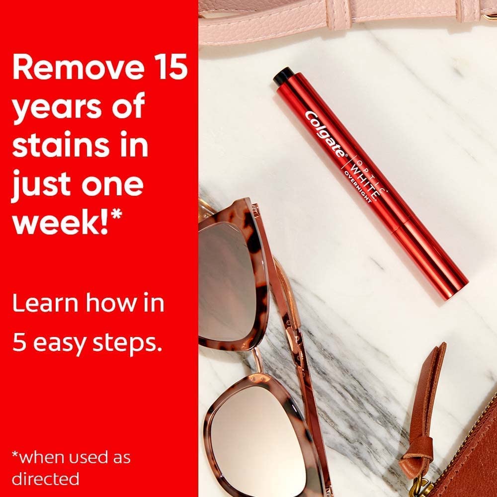 Whiten teeth while you sleep. In as little as a week (two weeks of treatment is recommended for best results), these Optic White teeth whitening pens whiten your teeth up to two shades and have 15X more whitening power in 1 treatment versus brushing alone, unlike other tooth whitening pens. The whitening pen pack includes one tooth whitener pen and one overnight stand for easy storage next to the sink or countertop. Gentle Whitening: We know teeth whitening sensitive teeth can be a pain. That's why our enamel safe tooth whitening gel formula has been designed for no sensitive teeth during and after the whitening process. Easy to Use: Click the back of the pen to dispense the unique formula to clean, dry teeth. The teeth stain remover formula dries quickly and whitens your teeth overnight. To remove, simply brush your teeth when you wake up to white teeth.