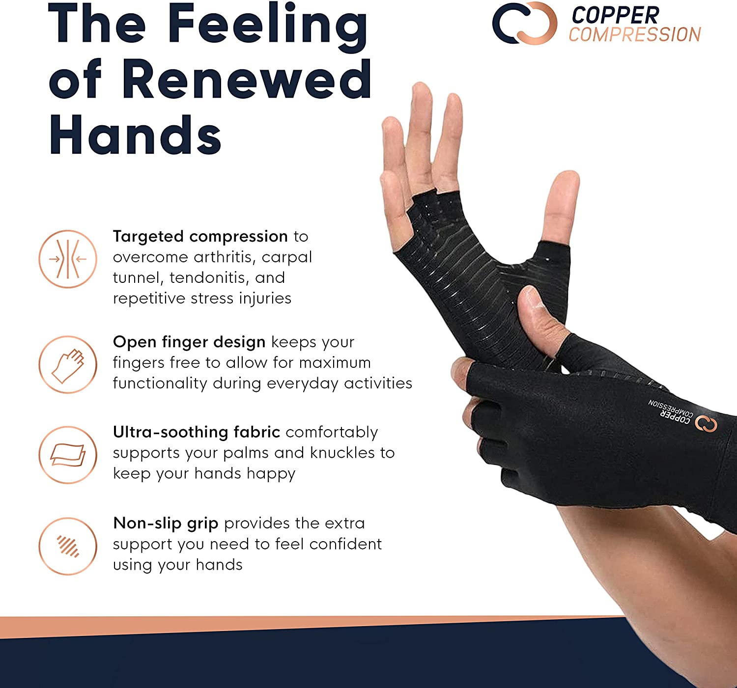 Copper Compression Arthritis Gloves - Best Copper Infused Fingerless Glove for Carpal Tunnel, RSI, Rheumatoid , Tendonitis, Hand Pain, Computer Typing, Support for Hands. Fit for Women & Men - 1 Pair