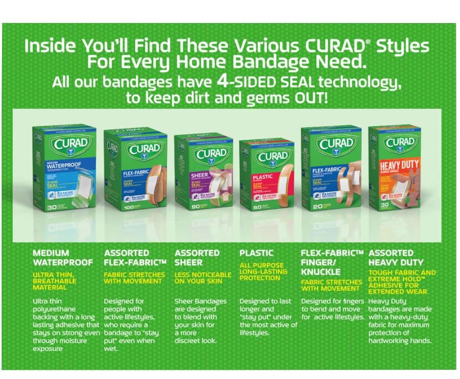 Inside you will find these various Curad styles. For every home bandage need. All our bandages have 4-sided seal technology, to keep dirt and germs out! Medium waterproof, Ultra thin, breathable material; Ultra thin polyurethane backing with a long lasting adhesive that stays on strong even through moisture exposure. Assorted Flex-Fabric, fabric stretches with movement; designed for people with active lifestyles, who require a bandage to "stay put" Even when wet. Assorted sheer, less noticeable on your skin; sheer bandages are designed to blend with your skin for a more discreet look. Assorted heavy duty/plastic, All Purpose long-lasting protection; designed to last longer and 'stay put' Under the most active of lifestyle; tough fabric and extreme hold adhesive for extended wear; heavy duty bandages are made with a heavy-duty fabric for maximum protection of hardworking hands. Flex-fabric finger/Knuckle, fabric stretches with movement; designed for fingers to bend and move for active lifestyles.