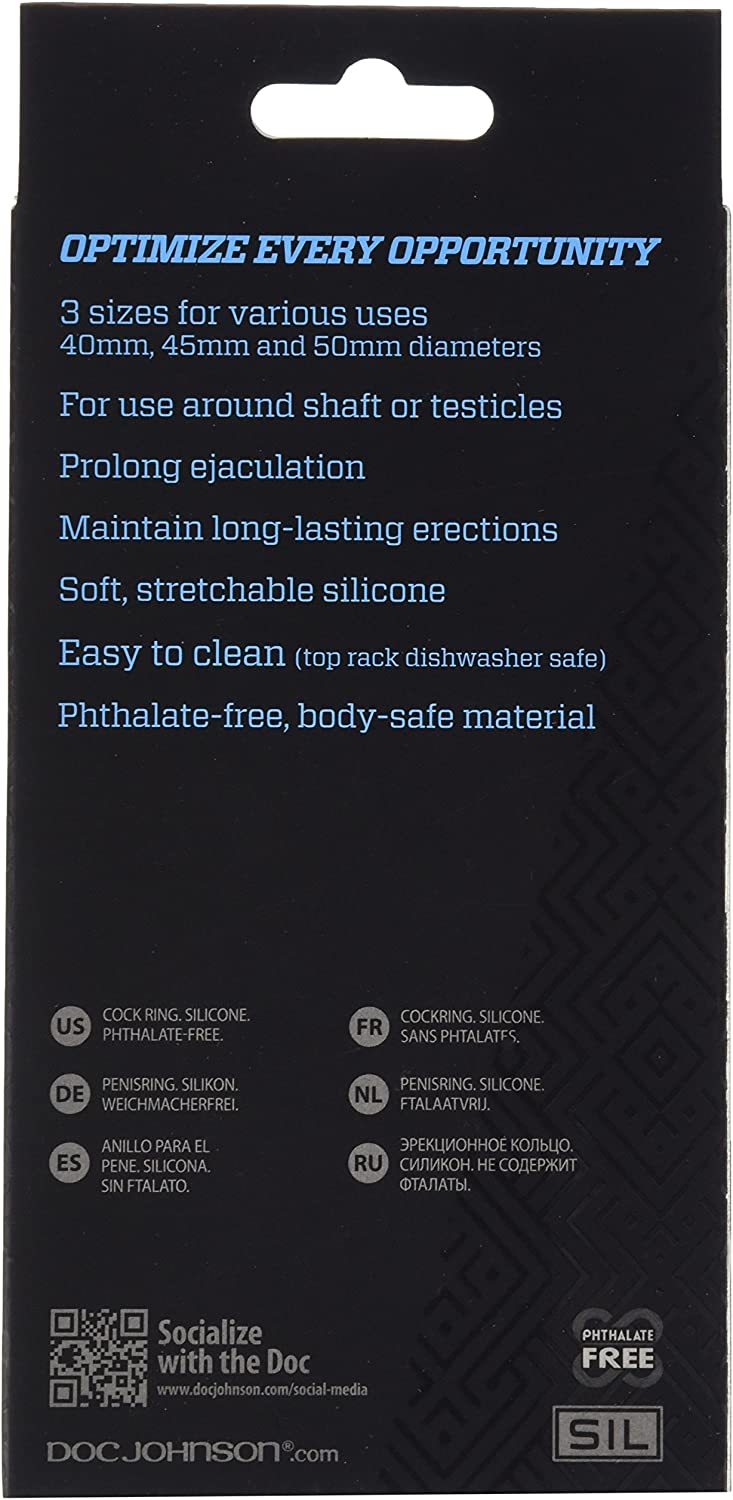Classically versatile and immeasurably pleasurable, the Thin 3 C-Ring set from Doc Johnson's Optimale collection offers a choice of three snug, supple silicone rings meant to enhance the sexual experience for both partners. Made of a velvety silicone with a silky, temperature receptive touch, the chosen ring can be worn over the shaft of the penis, or over both shaft and balls, or just around the balls, depending on your cock ring experience and the desired effect.