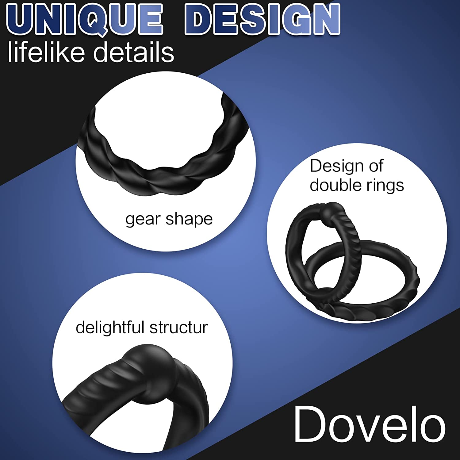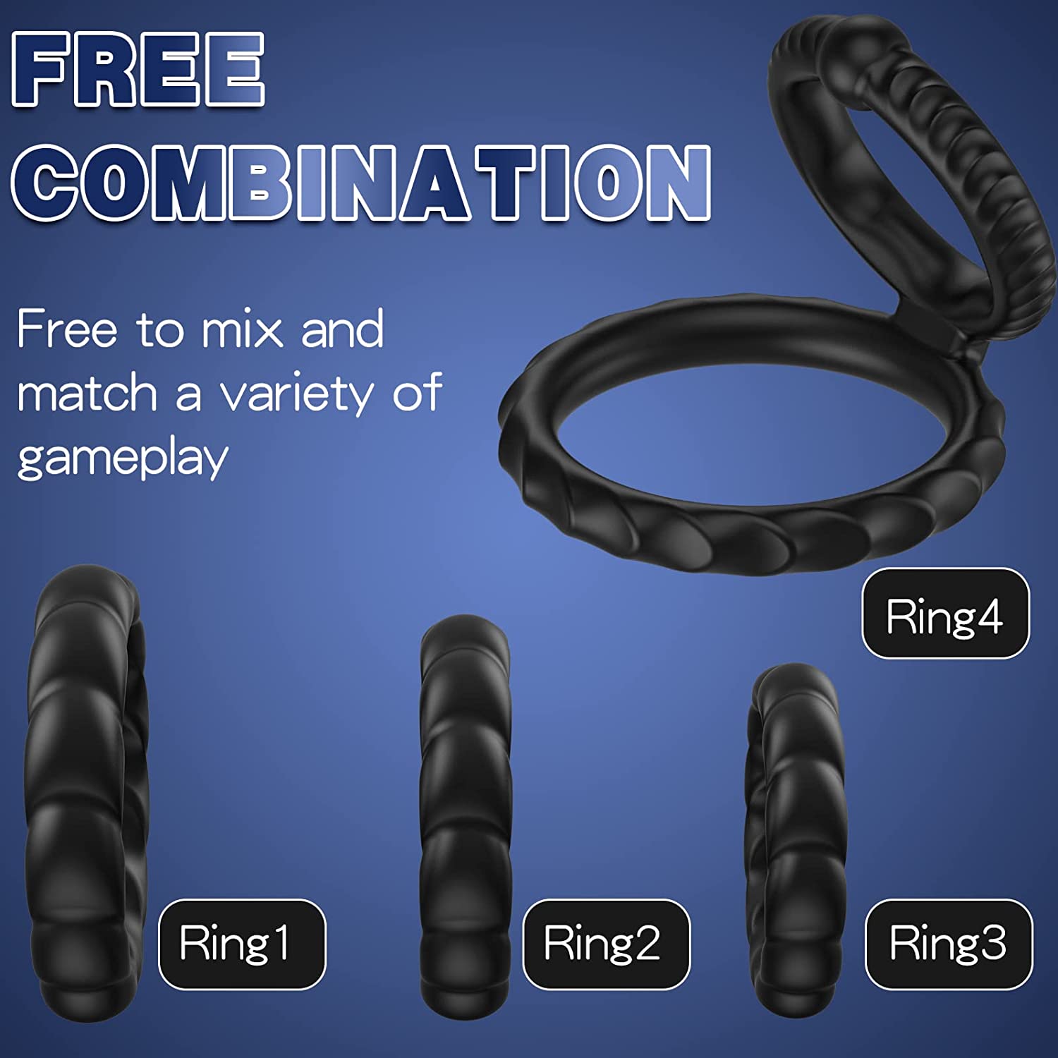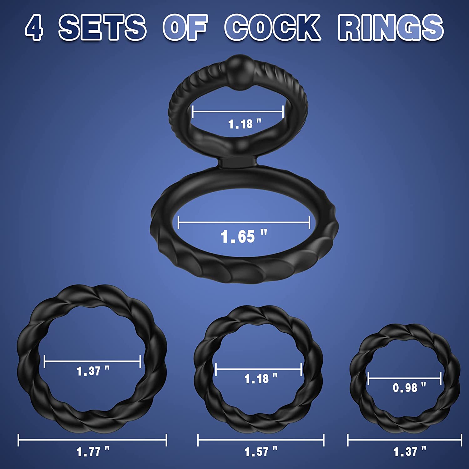 Dovelo Silicone Penis Rings 4 Piece Set, 3 Individual Ring Penis Rings in Different Sizes, 1 Dual Ring, Men's Advanced Training Penis Ring