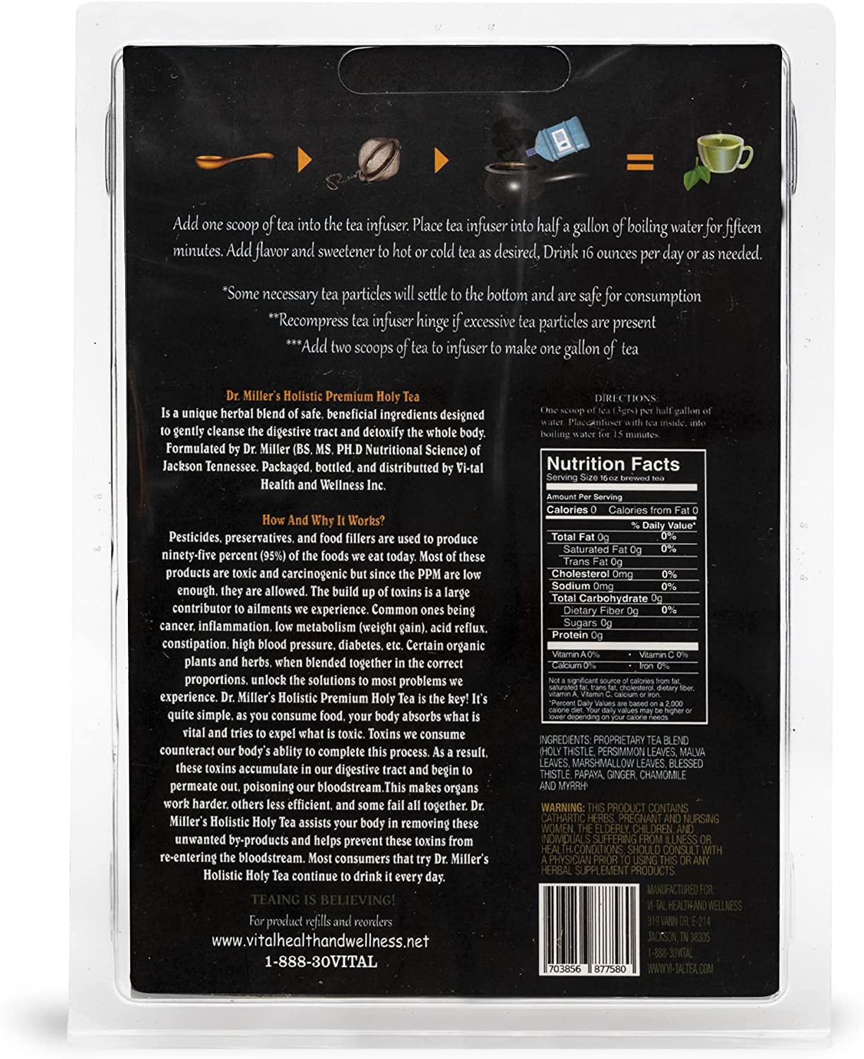 Comes with One Month Supply of loose Premium Holy Tea, one stainless steel 302 infuser, one hand carved measuring spoon. The Basic Tea Brewing Kit allows you to brew Dr. Miller’s Holistic Premium Holy Tea stronger, easier and faster within 15 minutes. This is the only known active beneficial tea on the planet Detoxifying the entire body and assisting your body with weight loss, minimizing joint pain and inflammation, stomach distress and bloating, acid reflux, lowering blood pressure, increased metabolism and mentally clarity. Be advised, this is an active tea, the recommended serving is at least 16 ounces daily. -Tea refills are always available- “Teaing is believing” Environmental Toxins can be responsible for problems you experience and Dr. Miller’s Tea helps rid your body of these harmful byproducts of living in today’s world. SCROLL DOWN TO CHECK OUT OUR INSTRUCTIONAL VIDEO