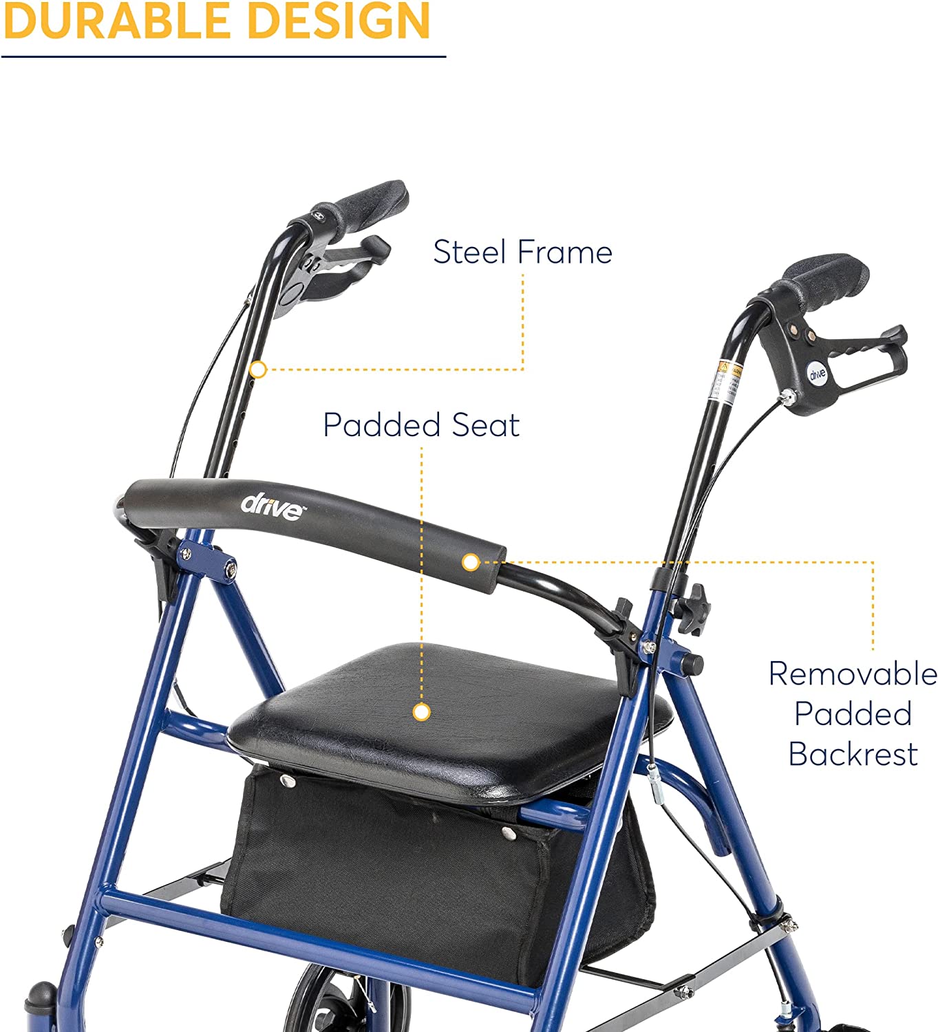 Drive Medical's portable rollator walker with seat continues to lead the charge when it comes to design, quality, and value. With a strong and steady steel frame, this 4-wheeled adult walker offers strength, support, durability, and comfort. The walker with seat and wheels comes complete with a hinged padded backrest, which can be removed by folding it up or down. The indoor and outdoor walker also boasts comfortable 12-inch square seat, a convenient pouch for personal items, and 7.5-inch wheel casters. The height-adjustable rollator's handles can moved up or down according to your height and are ergonomic to reduce undue stress on hands and joints. With the 4-wheel rollator walker as your travel companion, there is no need to overextend yourself because this standing walker doubles as a comfortable chair, allowing you to rest and refresh yourself anywhere and at any time. Backed by a limited lifetime warranty from Drive Medical, a leading brand of mobility aids and other medical goods for more than 20 years, you can purchase with confidence.