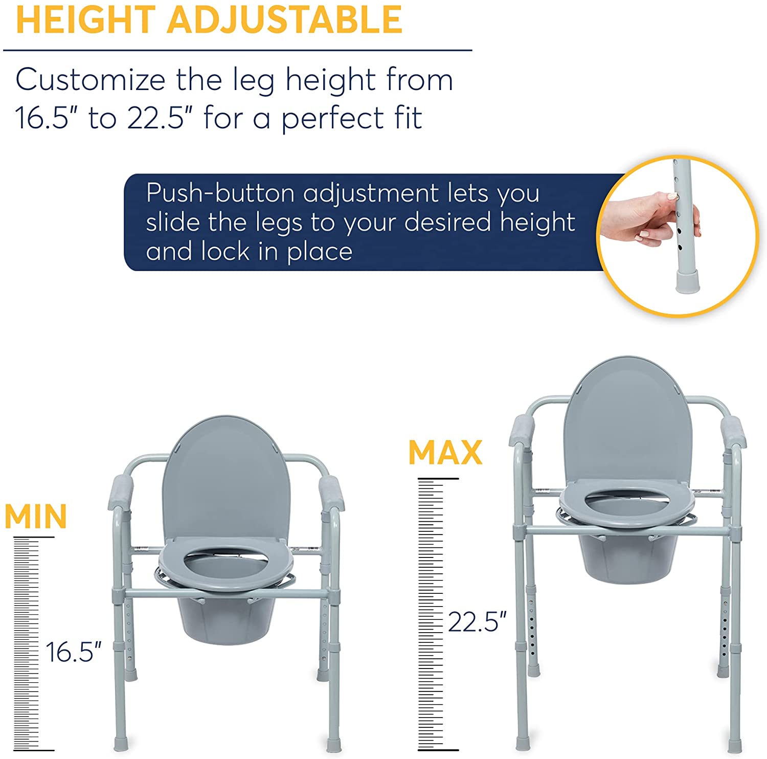 The Drive Medical folding toilet chair can be used as a bedside commode for elderly, individuals recovering from surgery or disabled individuals, or as a commode chair for toilet with arms, or a toilet safety frame. A durable plastic snap-on seat and grey powder-coated lid, featuring steel welded construction, increase the strength and durability of this toilet chair. For added comfort and safety, plastic arms, a 7.5-qt. commode bucket with a carry handle, cover, and splash shield are also included. Backed by a limited lifetime warranty from Drive Medical, a leading brand of bath safety products, mobility aids, and other medical goods for more than 20 years, you can purchase with confidence.