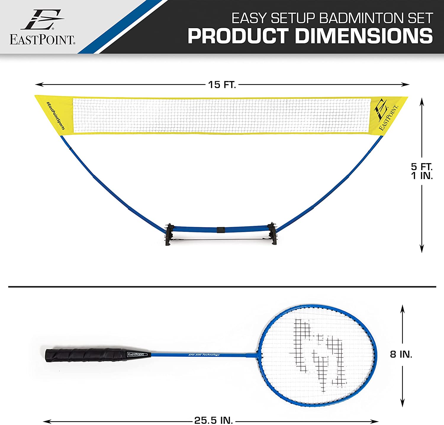 Where backyard sports with friends and family are concerned, nothing has quite the aerial appeal, easy learning curve, and fast-paced action of badminton. The EastPoint Sports Easy Setup Regulation Badminton Set includes everything you need to start playing: popular badminton rackets, net, and shuttlecocks. In addition, the convenient set requires no tools for setup, assembles in minutes and features storage for all accessories in its base. Our recreational, portable badminton set that is attractive and functional, ideal for beginners and seasoned veterans, and super quick to set up and pack away. Get ready to go outdoors and turn your picnic, driveway, or camping site into a fun competition that will keep energy in the air for hours! Looking for more action? Be sure to check out all the sports game products that EastPoint Sports has to offer, from bean bag toss and table tennis to volleyball and Kan Jam.